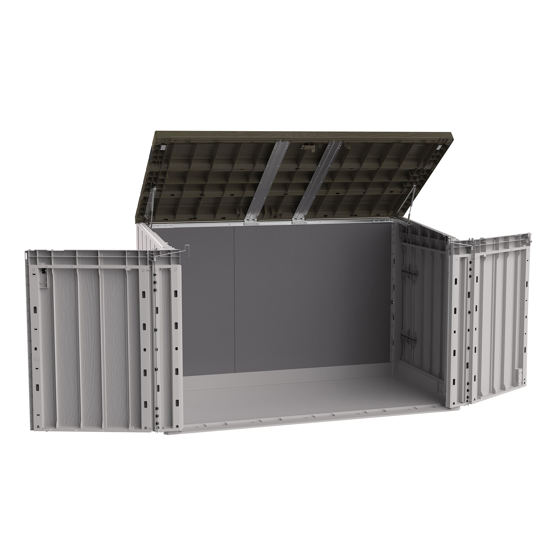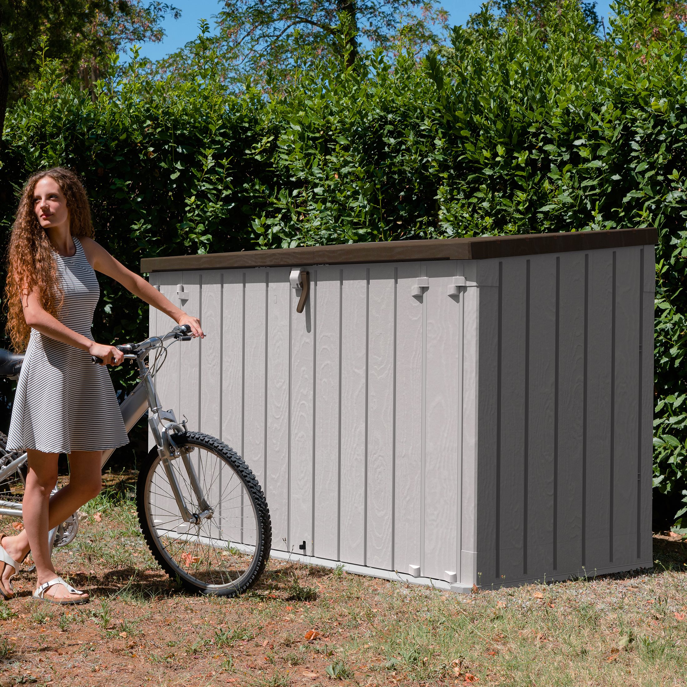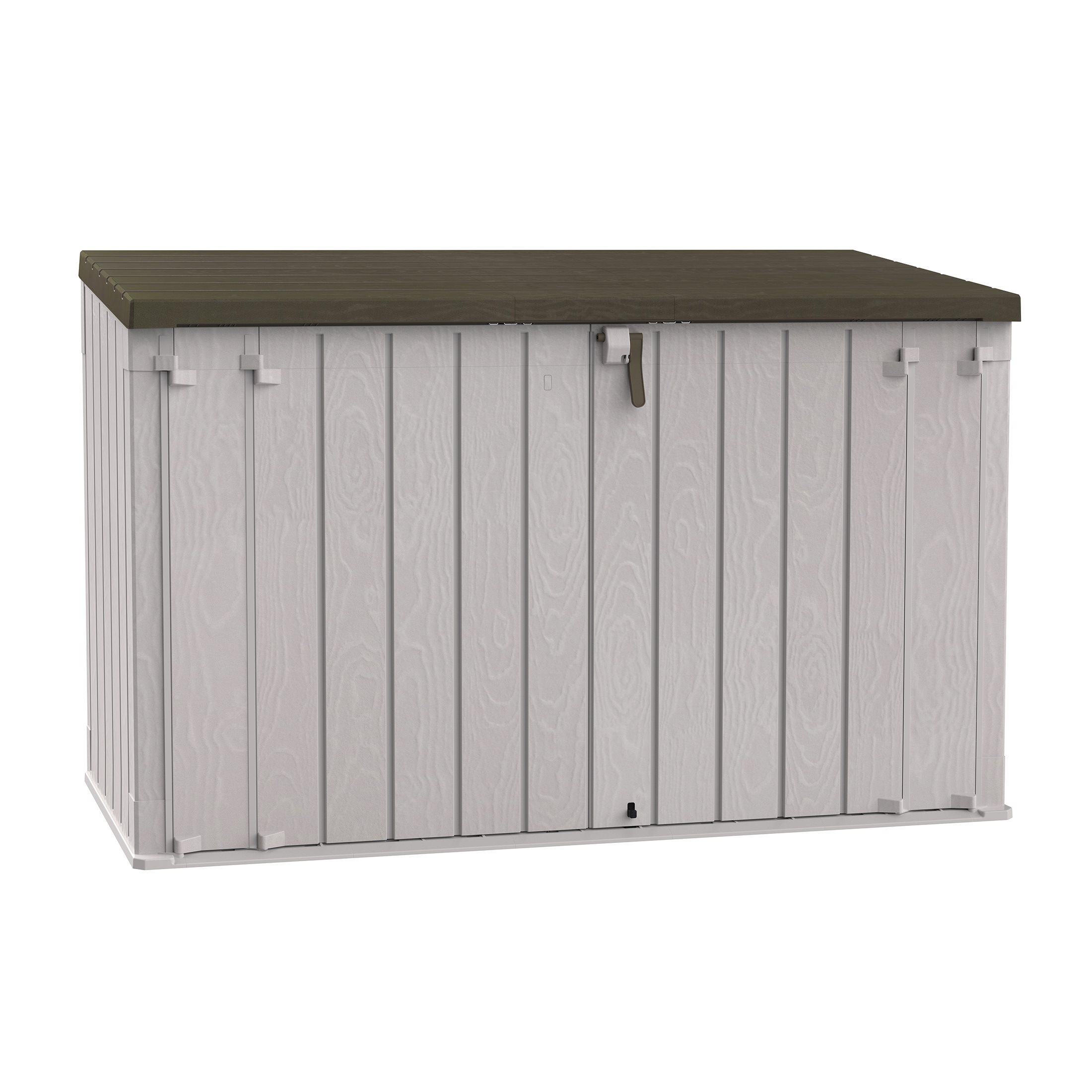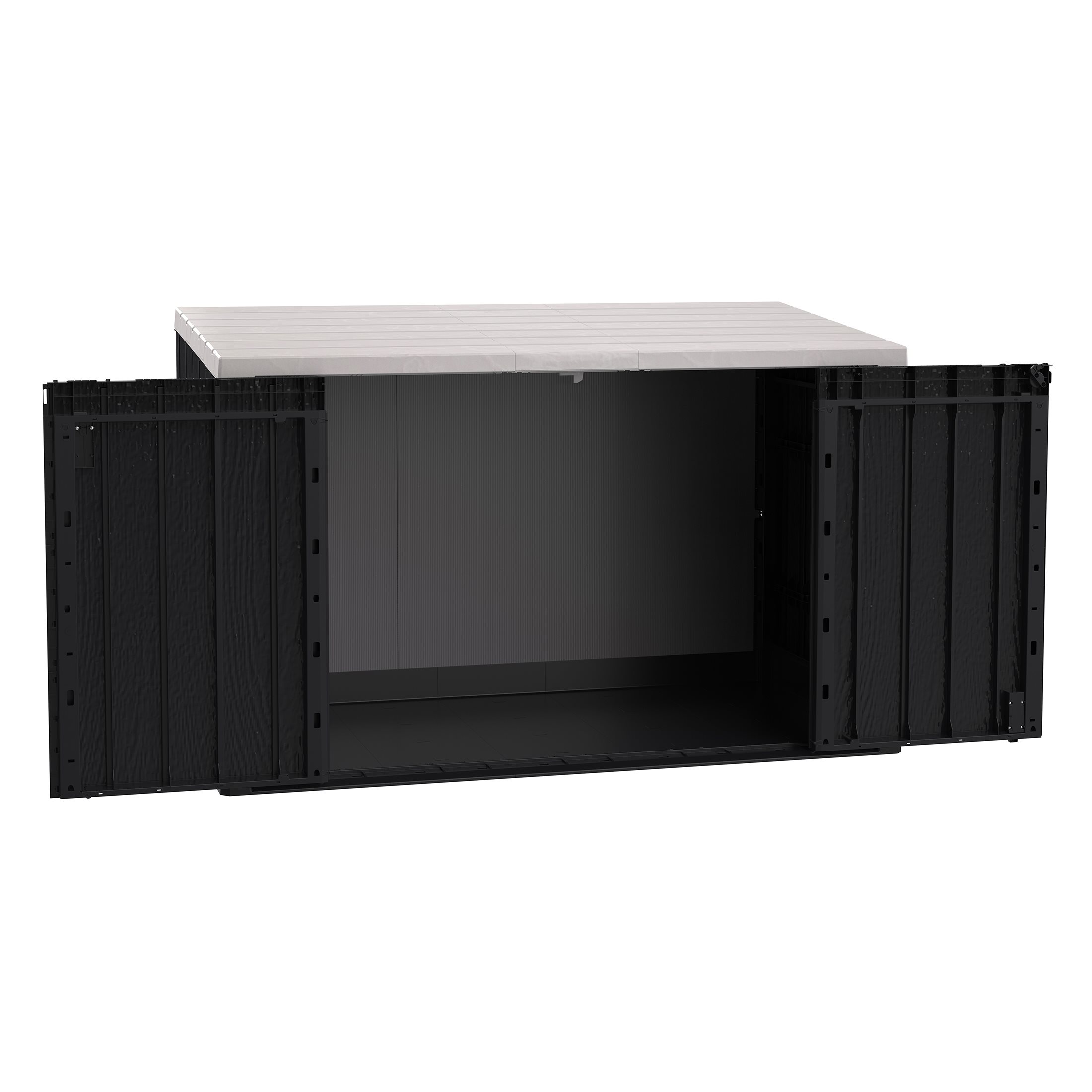 The Stora Way Plus 3XL Tool Box is the perfect solution for storing large garden tools and equipment. Its maximum capacity of 2770 litres allows you to conveniently store deckchairs, lawnmowers and many other objects. The padlock hole offers the possibility of locking everything in complete safety (padlock not supplied). It is made of recycled and recyclable plastic (polypropylene), resistant to water and UV rays.