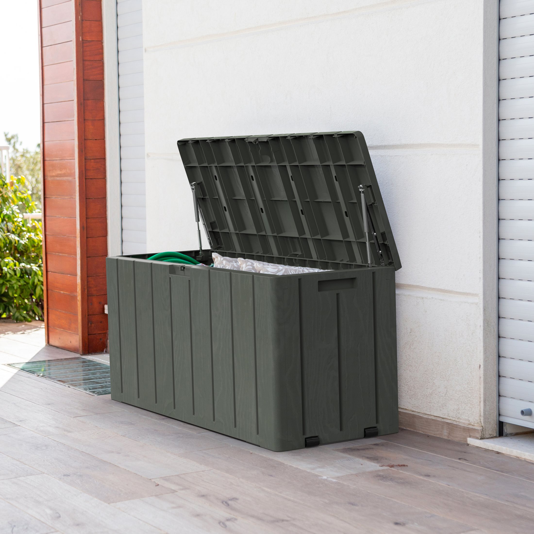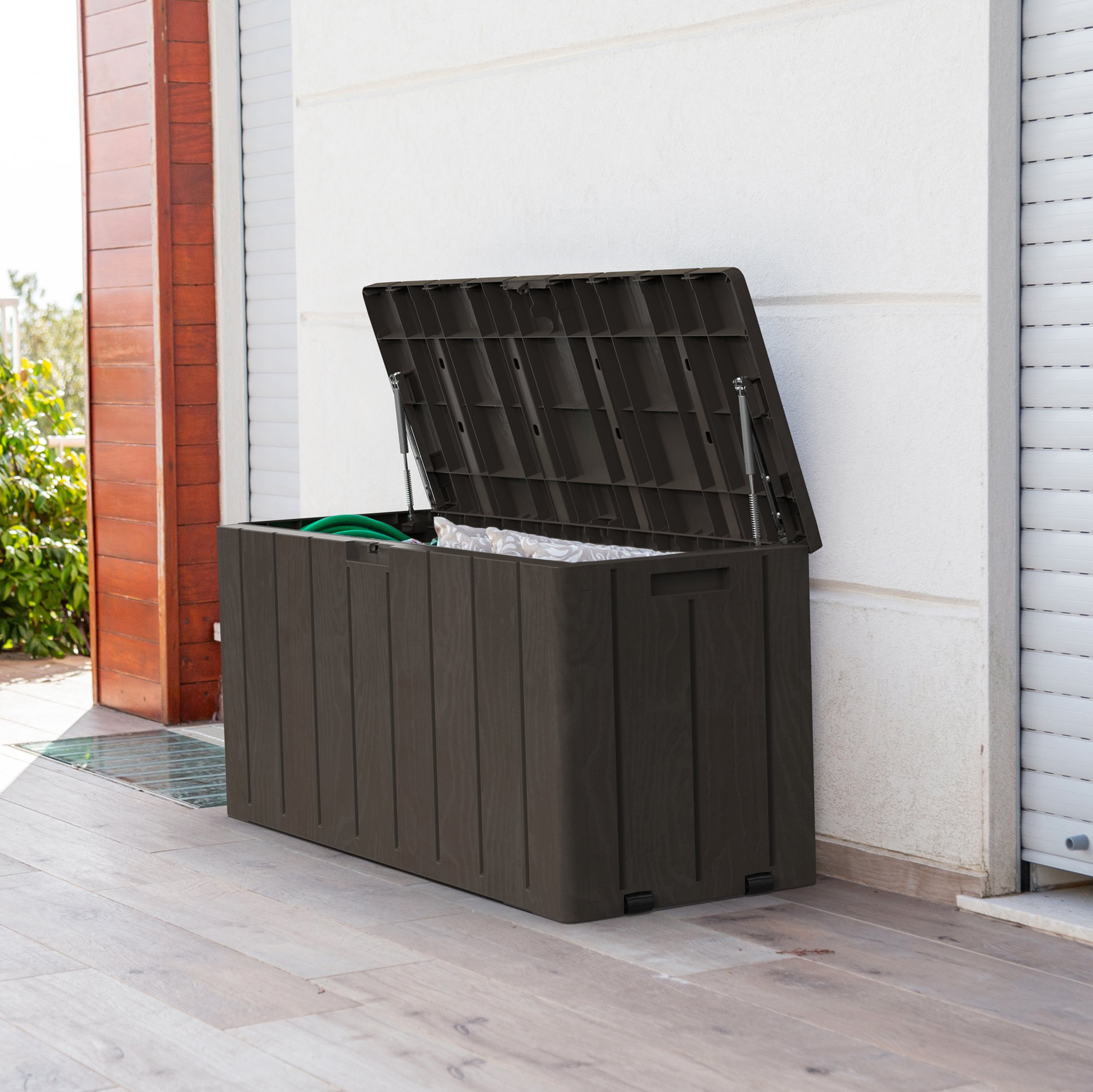 The Bravo 270 Plus multibox combines the practicality of plastic with the natural aesthetics of wood. Crafted with high-quality materials that faithfully replicate the warmth and beauty of natural wood, it provides a versatile solution for household storage. Equipped with pistons that facilitate opening and closing, featuring a weather-resistant design, it's suitable for both indoor and outdoor use, ensuring protection for stored items. Easy to clean and maintain, it's the perfect choice for those seeking practicality without sacrificing elegance.