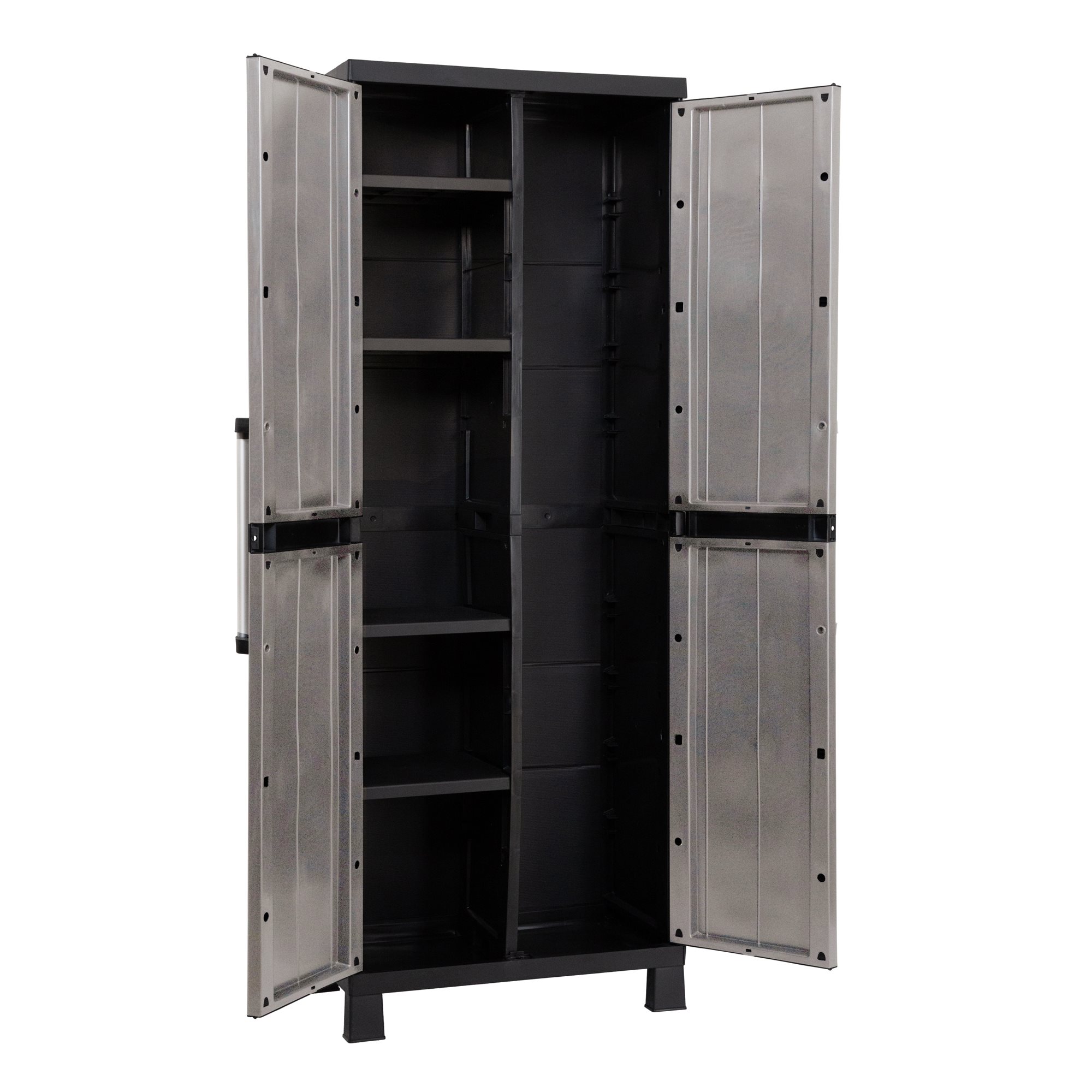 L'armadio portascope in plastica con maniglie in metallo offre una soluzione robusta per l'organizzazione degli utensili domestici. Dotato di quattro ripiani interni regolabili in altezza, offre ampio spazio per riporre scope e altri strumenti per la pulizia, mantenendoli organizzati e a portata di mano. I piedini sollevano l'armadio dal suolo, proteggendo i contenuti dall'umidità e semplificando la pulizia sottostante. Le maniglie in metallo garantiscono una presa sicura e duratura. Leggero ma resistente, è ideale per garage, cantine o ripostigli. La plastica assicura durabilità e facilità di manutenzione, rendendolo una scelta pratica per la casa.