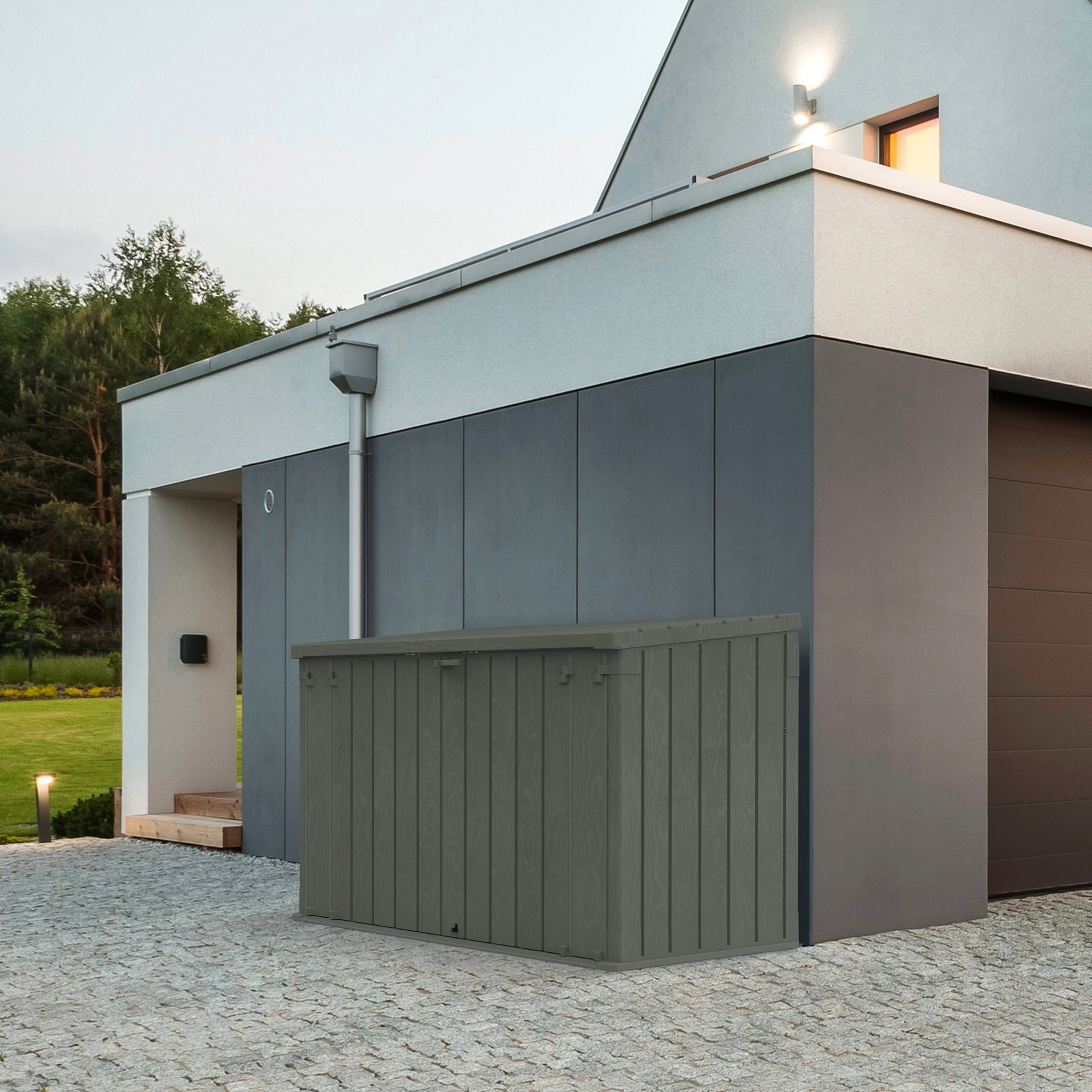 The Storer Plus 2XL Tool Box is the perfect solution for storing large garden tools and equipment. Its maximum capacity of 2270L allows you to conveniently store deckchairs, lawnmowers and many other objects. The padlock hole offers the possibility of locking everything in complete safety (padlock not supplied). It is made of recycled and recyclable plastic (polypropylene), resistant to water and UV rays.
