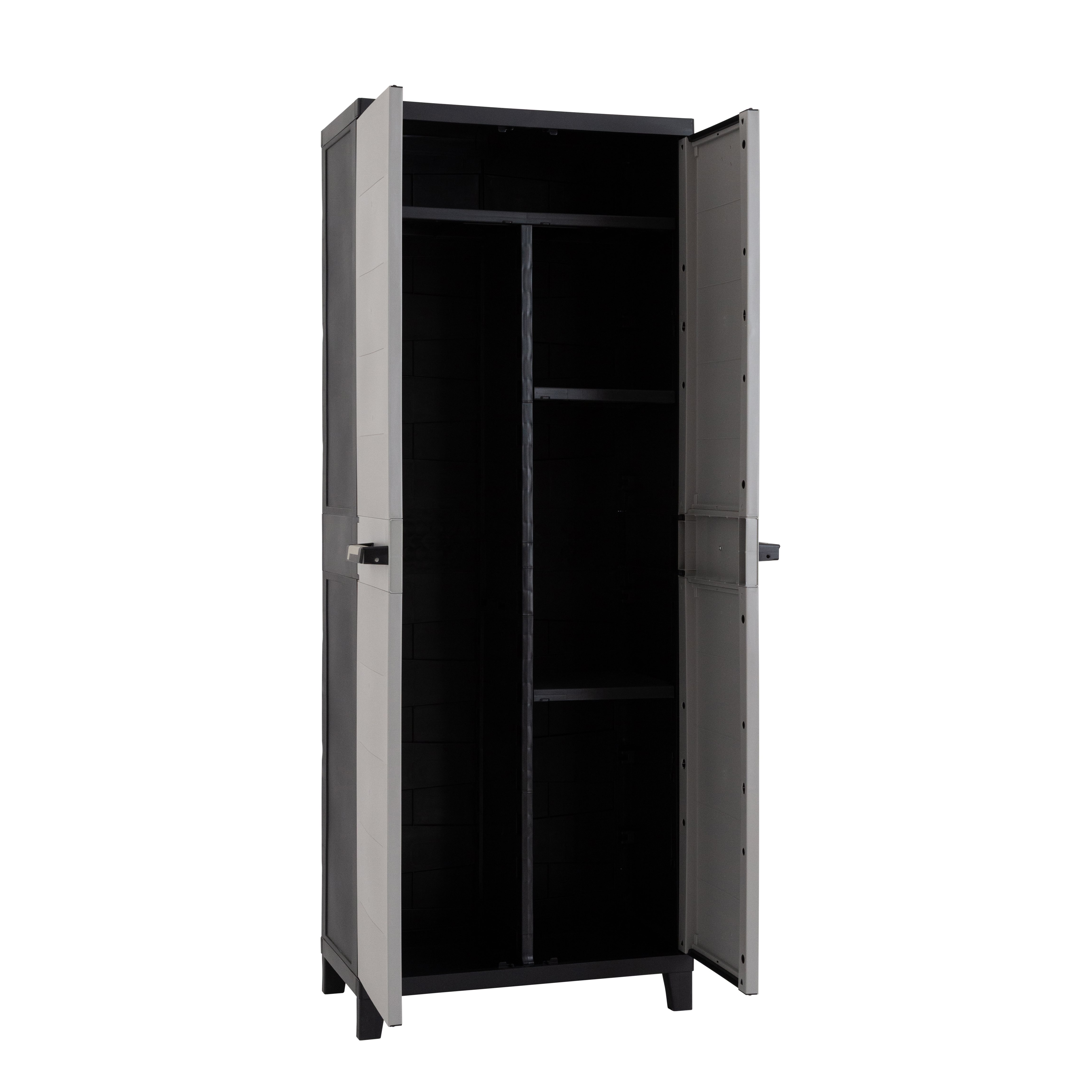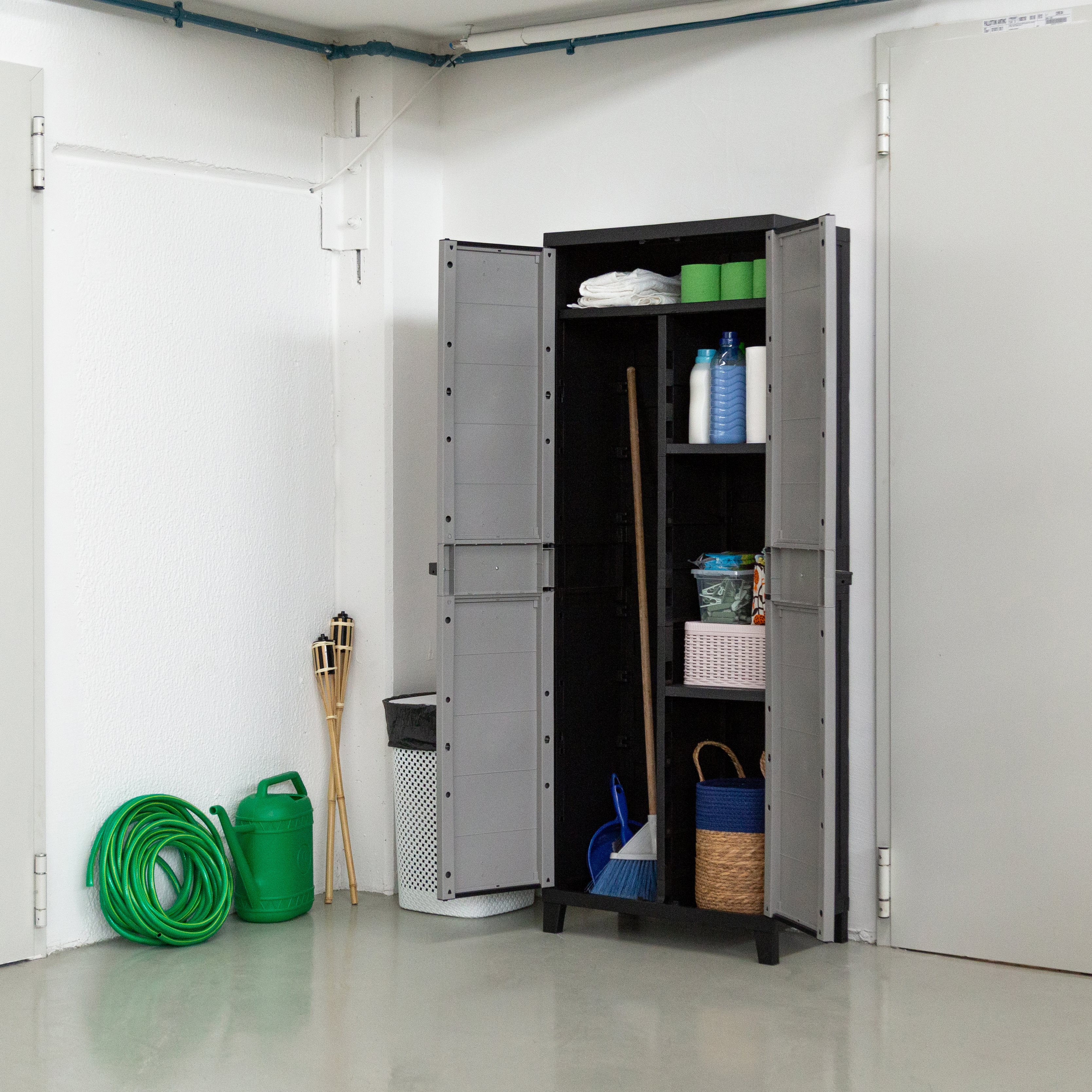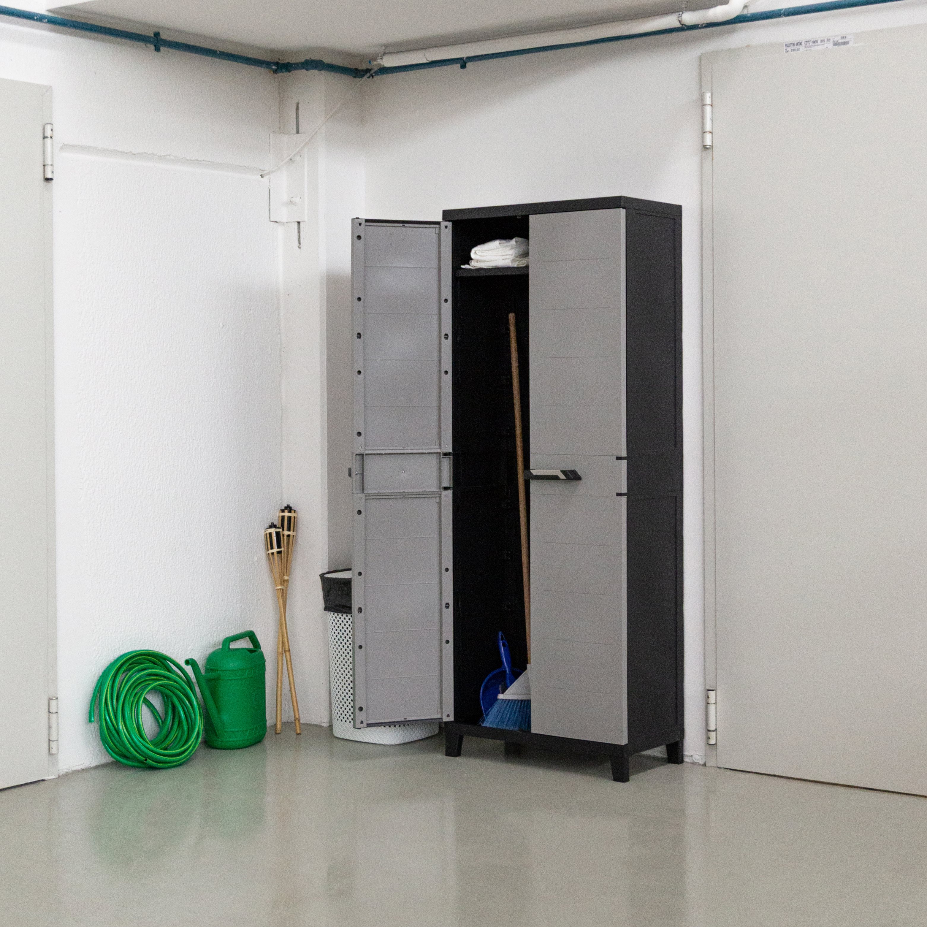 The PRIME utility cabinet offers a compact solution for home tool organization. Equipped with two doors, it provides easy access and protection for items inside. The internal shelves offer ample space to store brooms, mops, and other cleaning tools, keeping them organized and out of sight. The feet elevate the closet from the ground, protecting contents from moisture and facilitating cleaning underneath. Lightweight and durable, it's ideal for garages, basements, or storage rooms. Plastic ensures durability and ease of cleaning, making it a practical choice for the home.