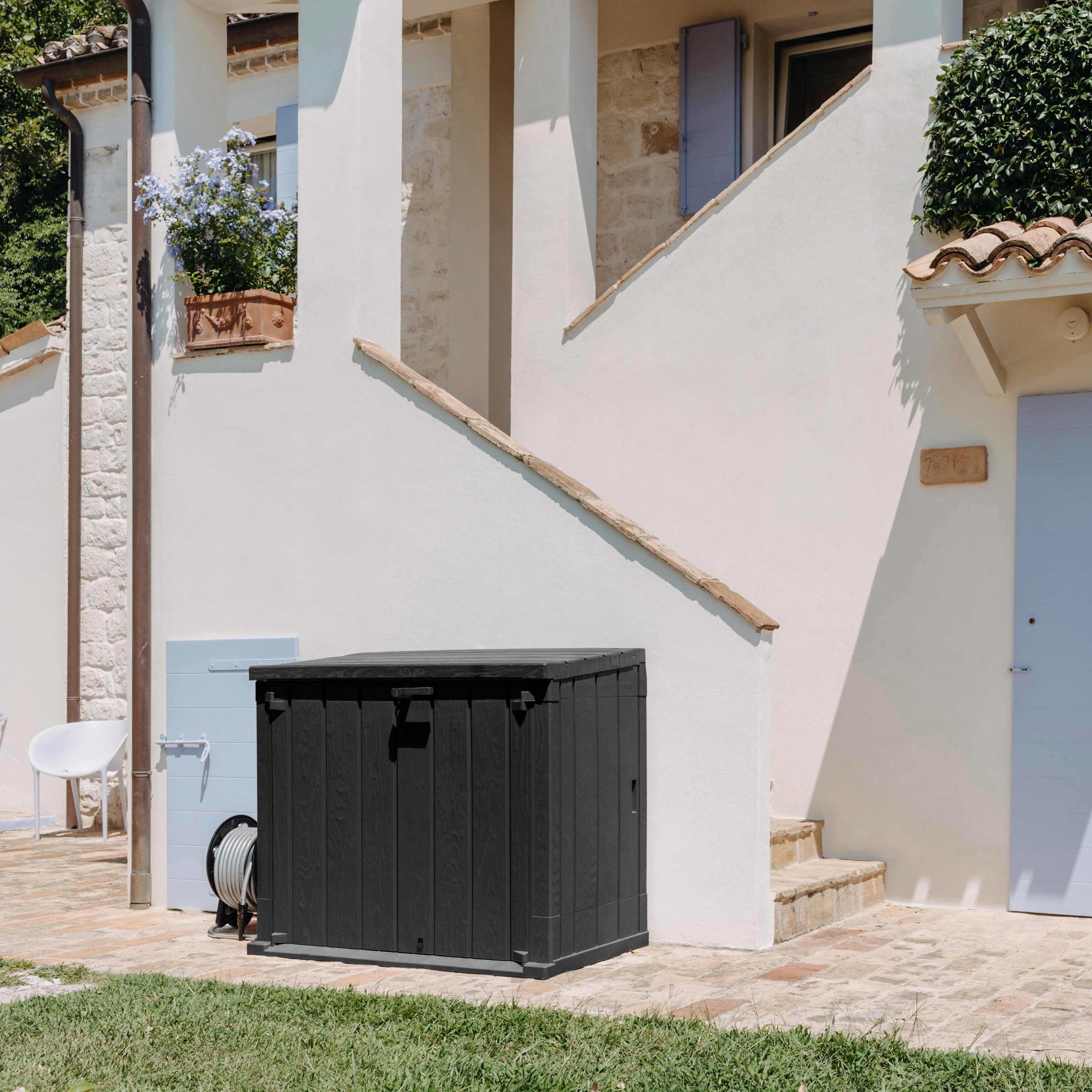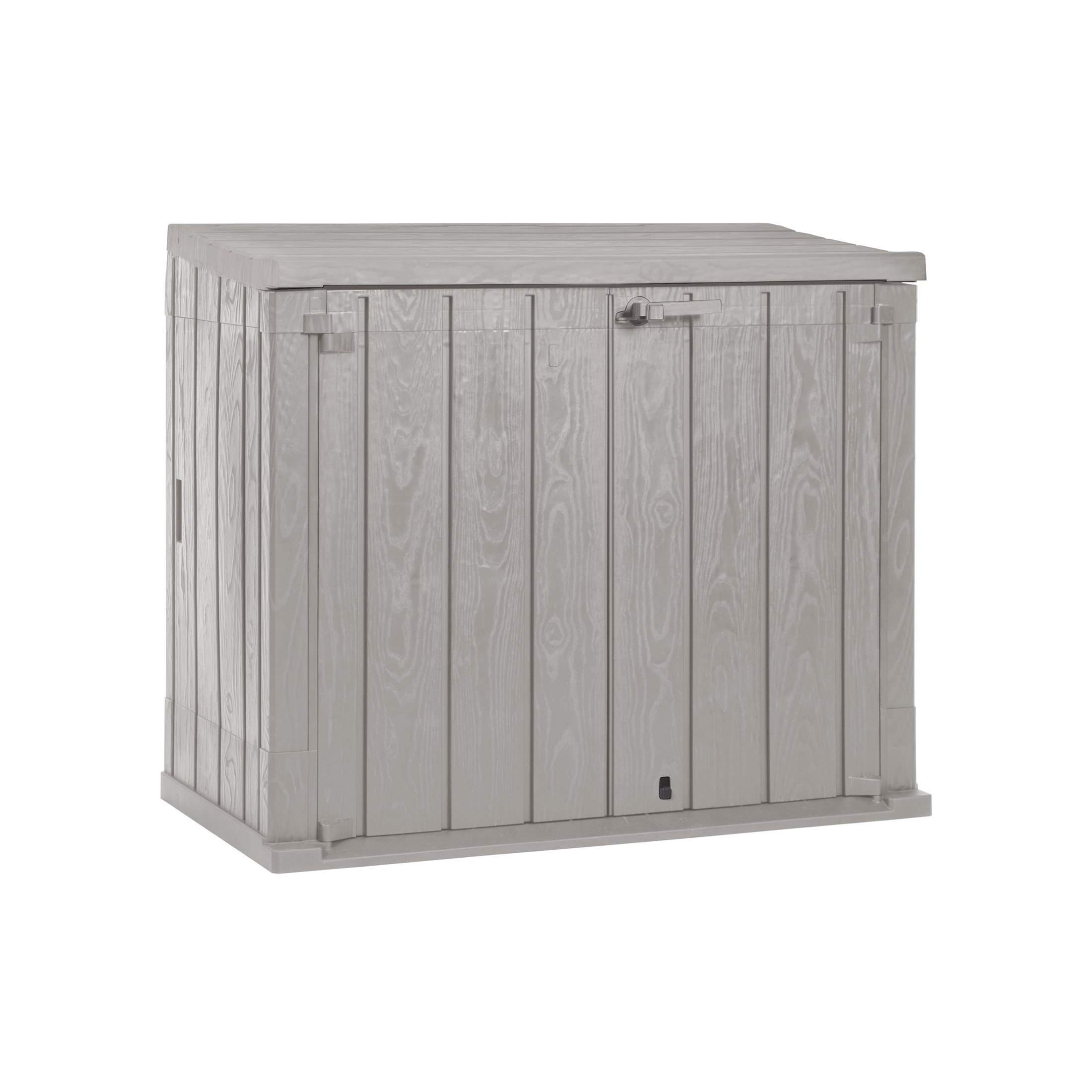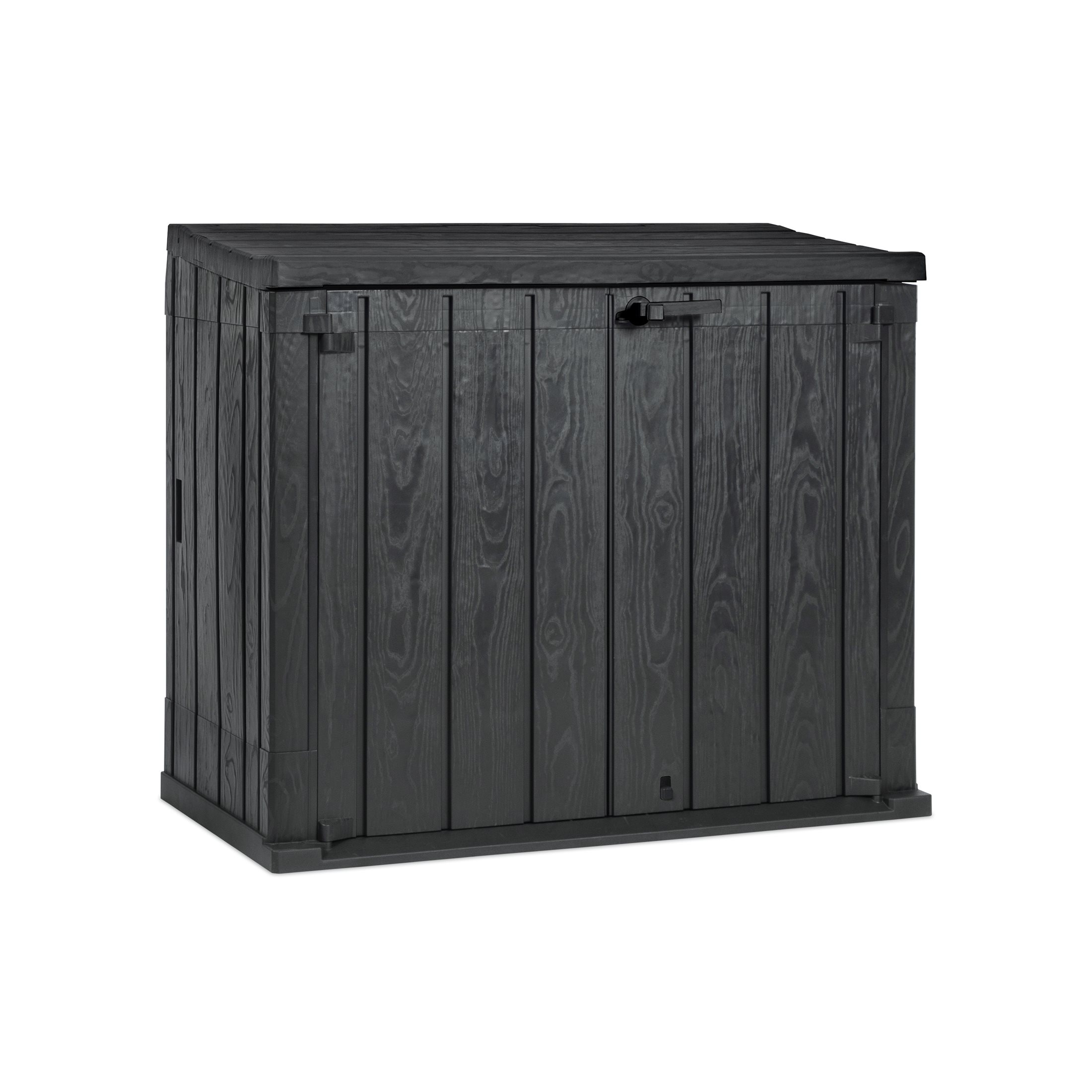 Il Baule Storer Plus è un portattrezzi da esterni con una capacità di 842 litri, ideale per riporre attrezzi da giardinaggio, cuscini e giochi. Realizzato in resina resistente ai raggi UV, combina funzionalità e stile con un elegante effetto legno in colore antracite/grigio tortora. Il baule è facile da montare con gli appositi attrezzi e dispone di prese d'aria per prevenire muffe e cattivi odori. È dotato di foro per il lucchetto (non incluso) per una maggiore sicurezza. Perfetto per mantenere il giardino ordinato e protetto.