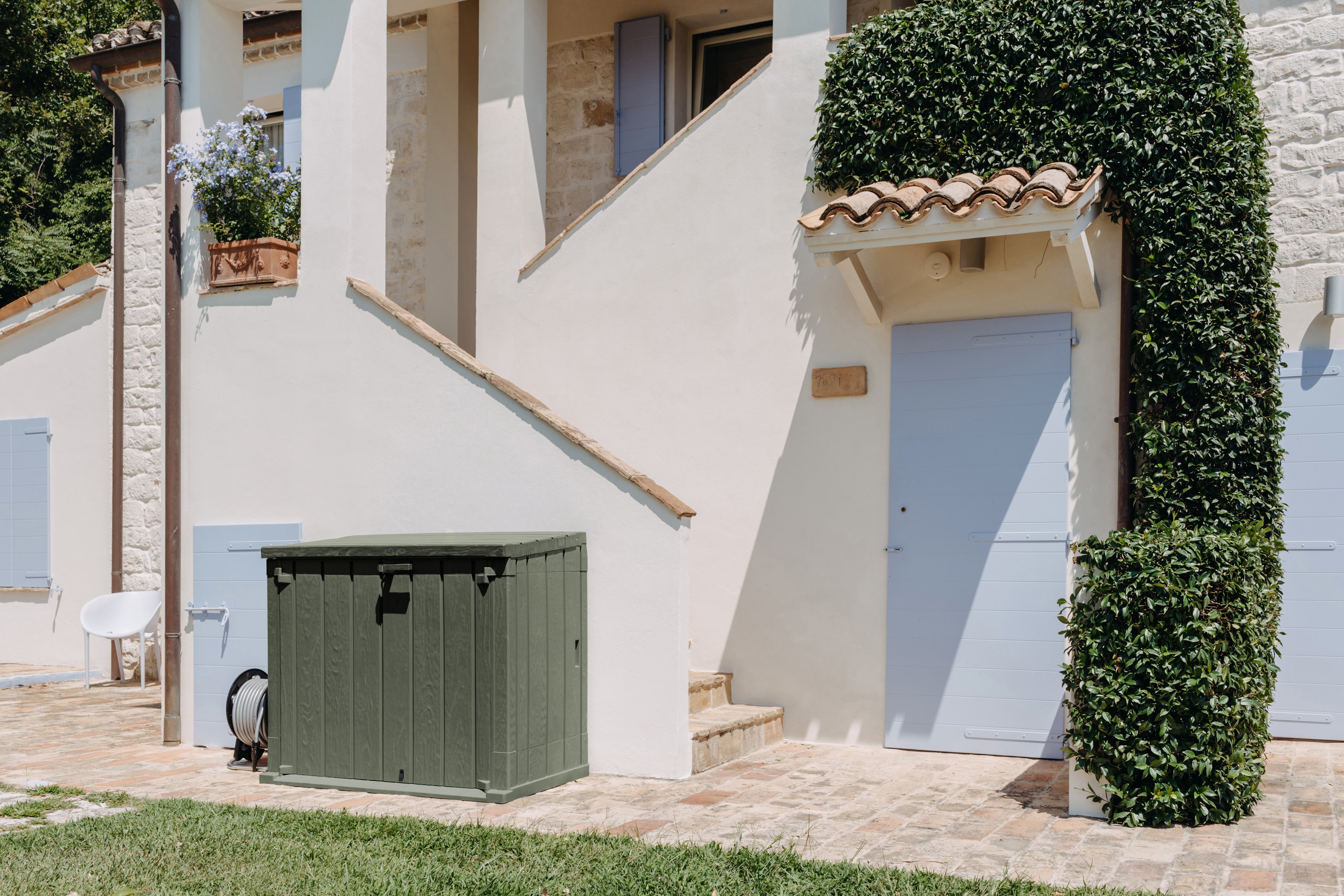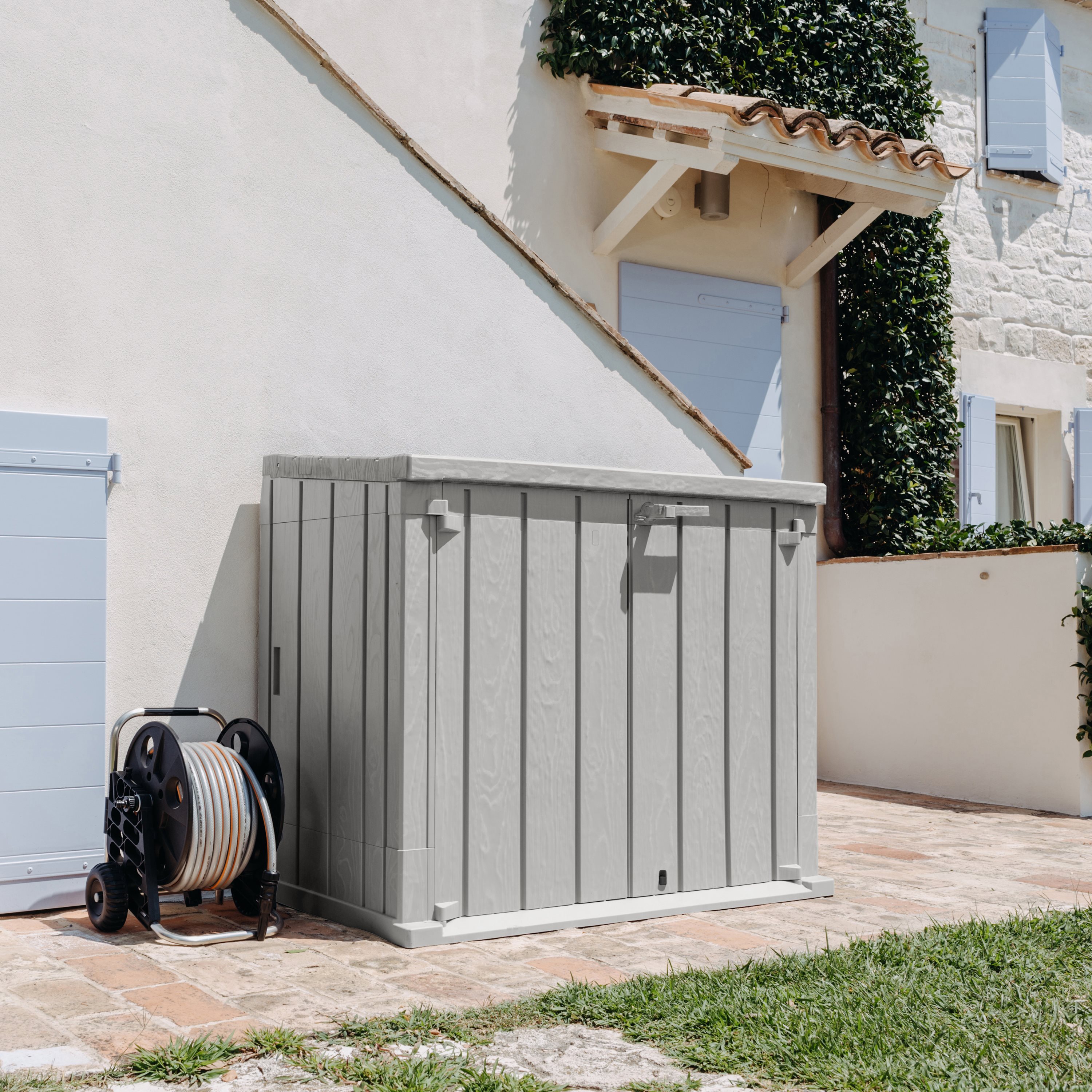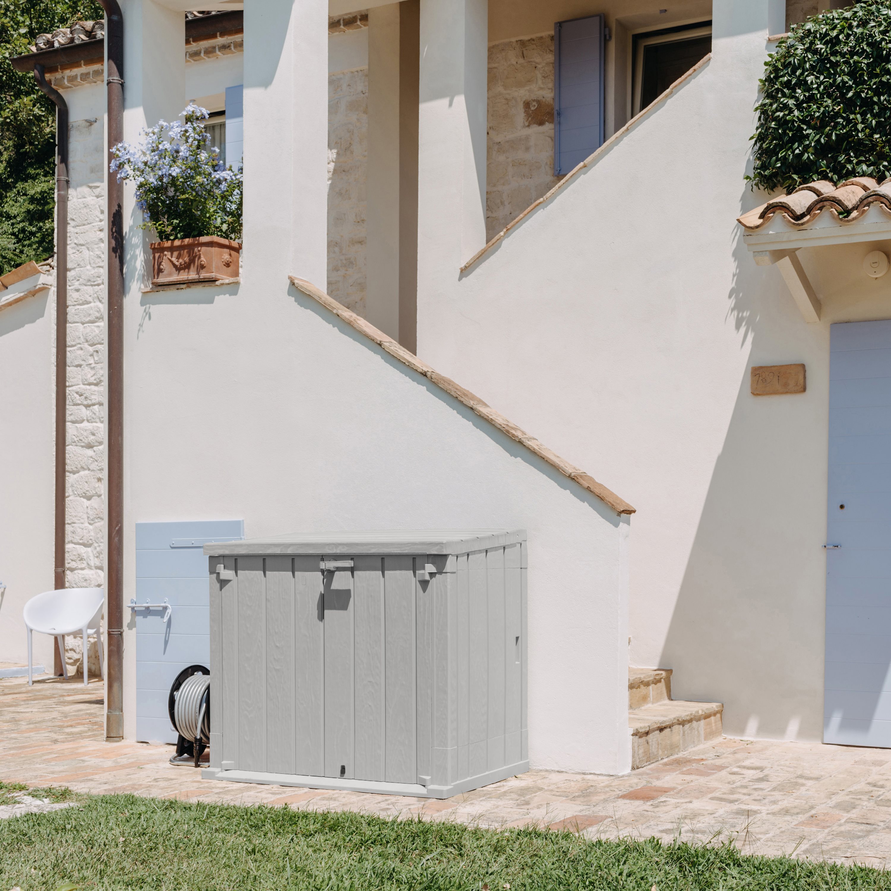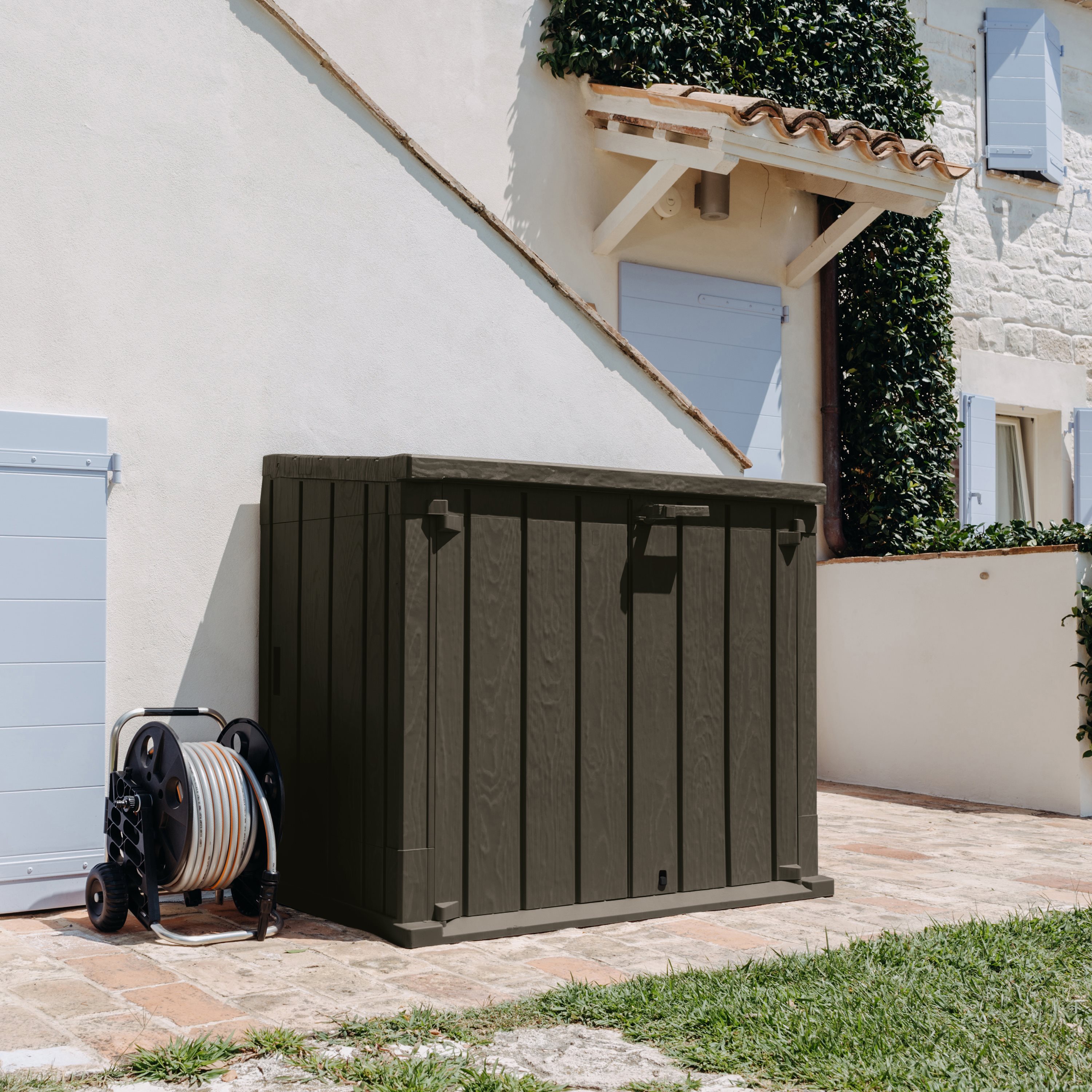 Il Baule Storer Plus è un portattrezzi da esterni con una capacità di 842 litri, ideale per riporre attrezzi da giardinaggio, cuscini e giochi. Realizzato in resina resistente ai raggi UV, combina funzionalità e stile con un elegante effetto legno in colore antracite/grigio tortora. Il baule è facile da montare con gli appositi attrezzi e dispone di prese d'aria per prevenire muffe e cattivi odori. È dotato di foro per il lucchetto (non incluso) per una maggiore sicurezza. Perfetto per mantenere il giardino ordinato e protetto.