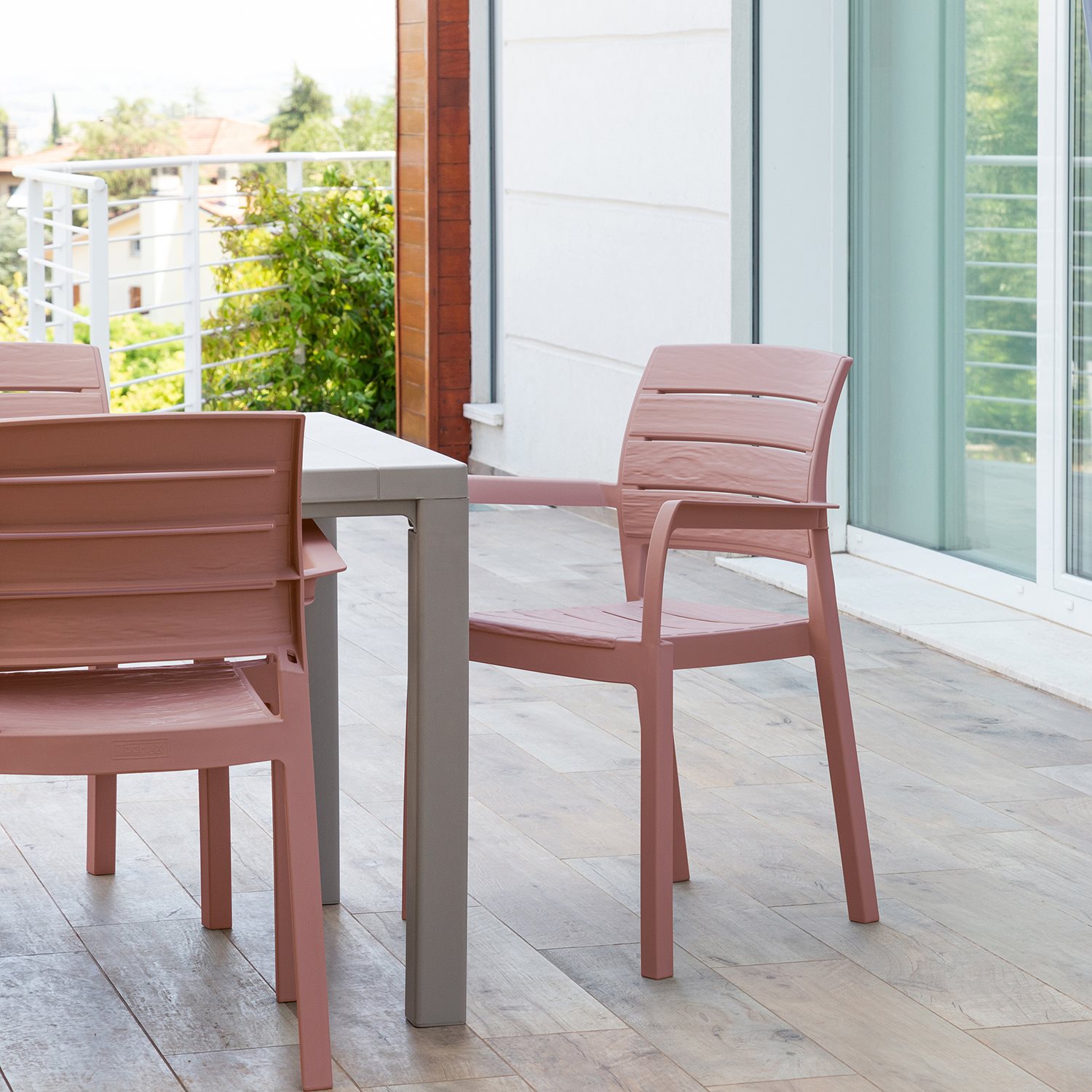 La sedia Recanati di Toomax è una soluzione confortevole per l'arredo di esterni. Dotata di braccioli, le sedie sono impilabili. Adatta ad usi interni ed esterni, è resistente ai raggi UV.