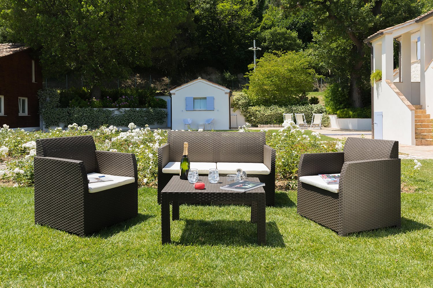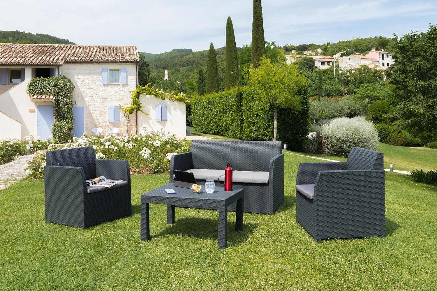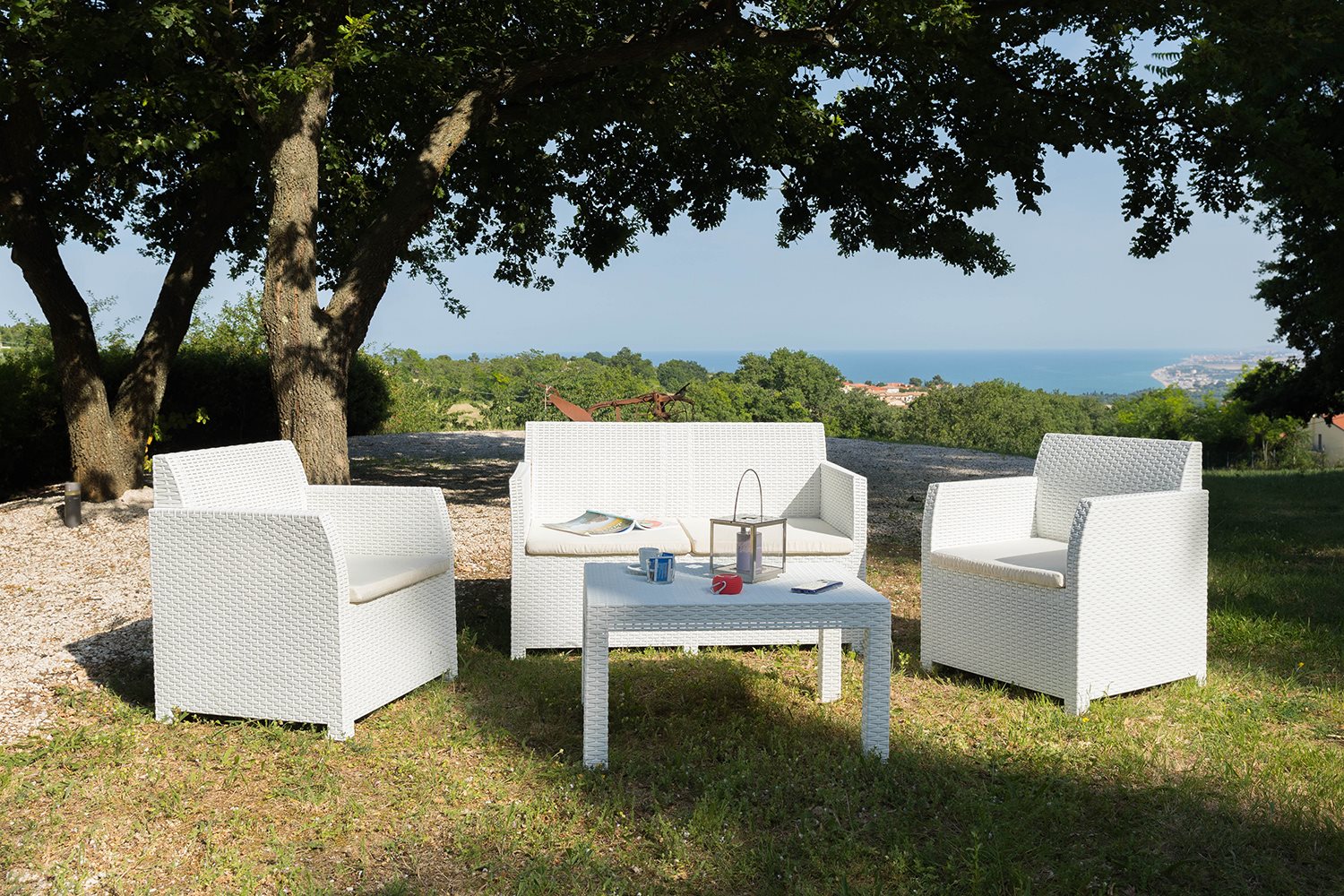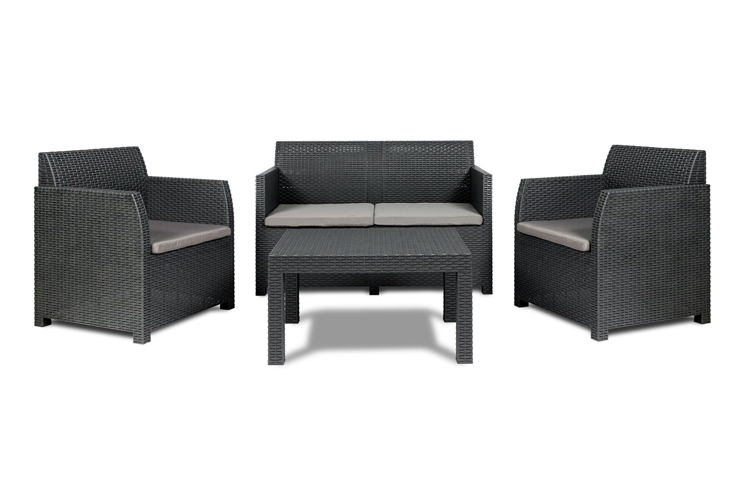 The Toomax Lavinia garden set consists of an elegant coffee table, a 2-seater sofa and 2 armchairs, perfect for creating an outdoor relaxation area. Made of UV-resistant polypropylene, this set is designed to last. The armchairs and sofa come with padded cushions for maximum comfort. Easy to assemble and maintain, the Lavinia set is ideal for enjoying relaxing moments outdoors in style.