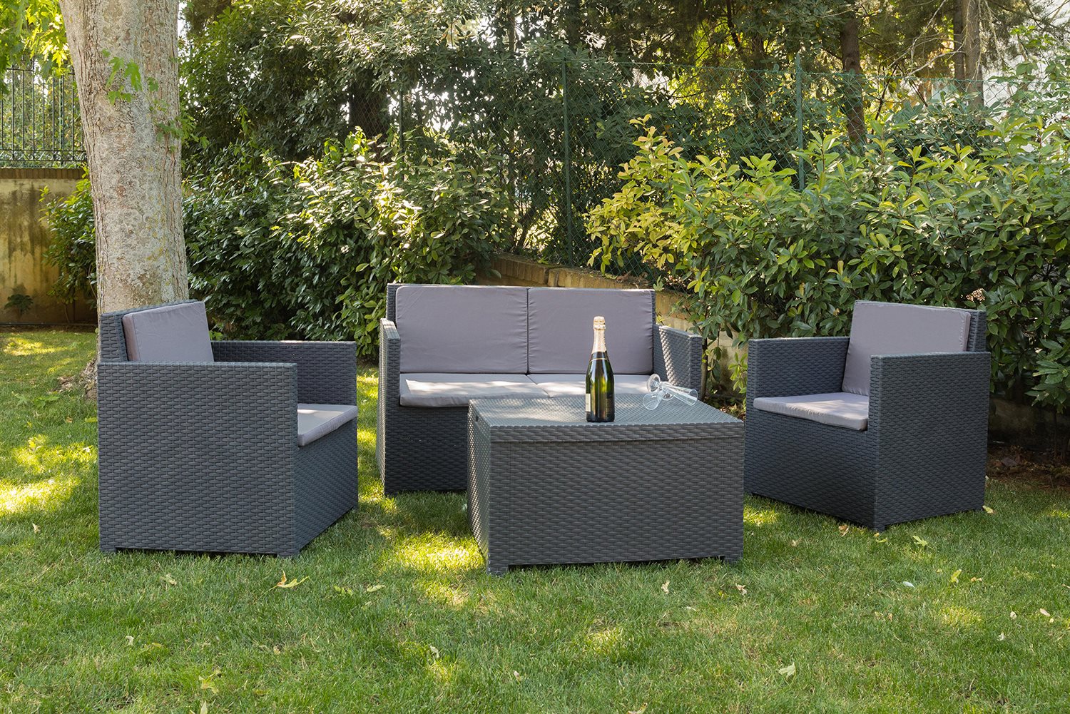 Aurelia set of 2 armchairs with cushions and 1 garden table, resistant to UV rays. Ergonomic backrest and easy to clean. Ideal for garden, balcony or terrace. Easy to assemble without tools thanks to the plug-in connections and pins provided.