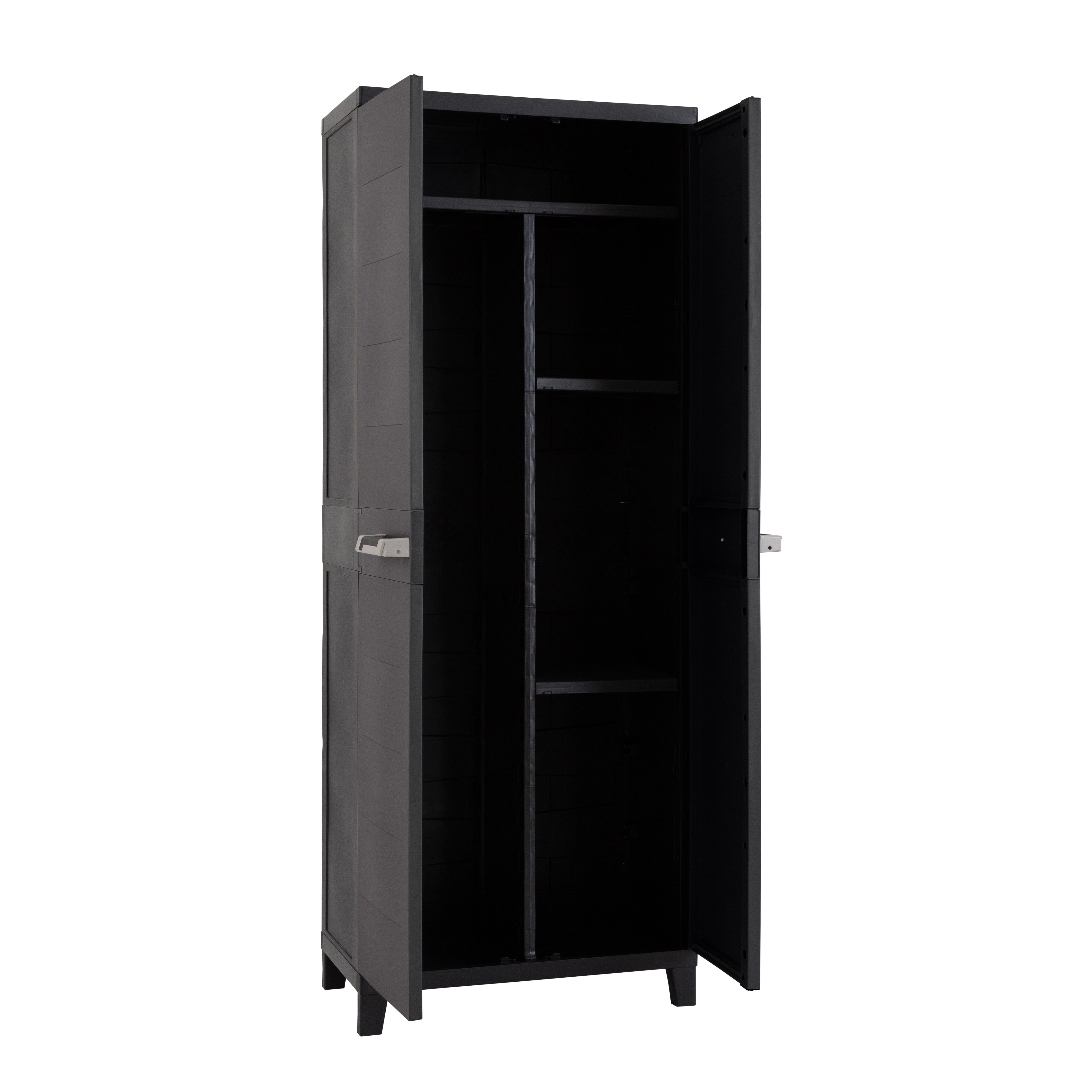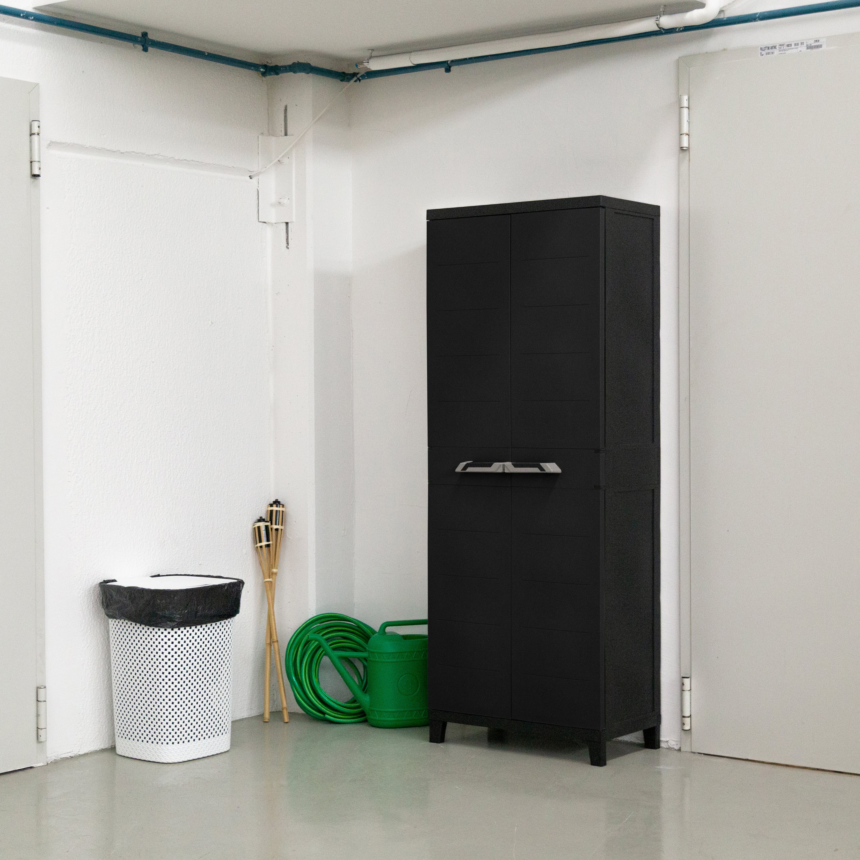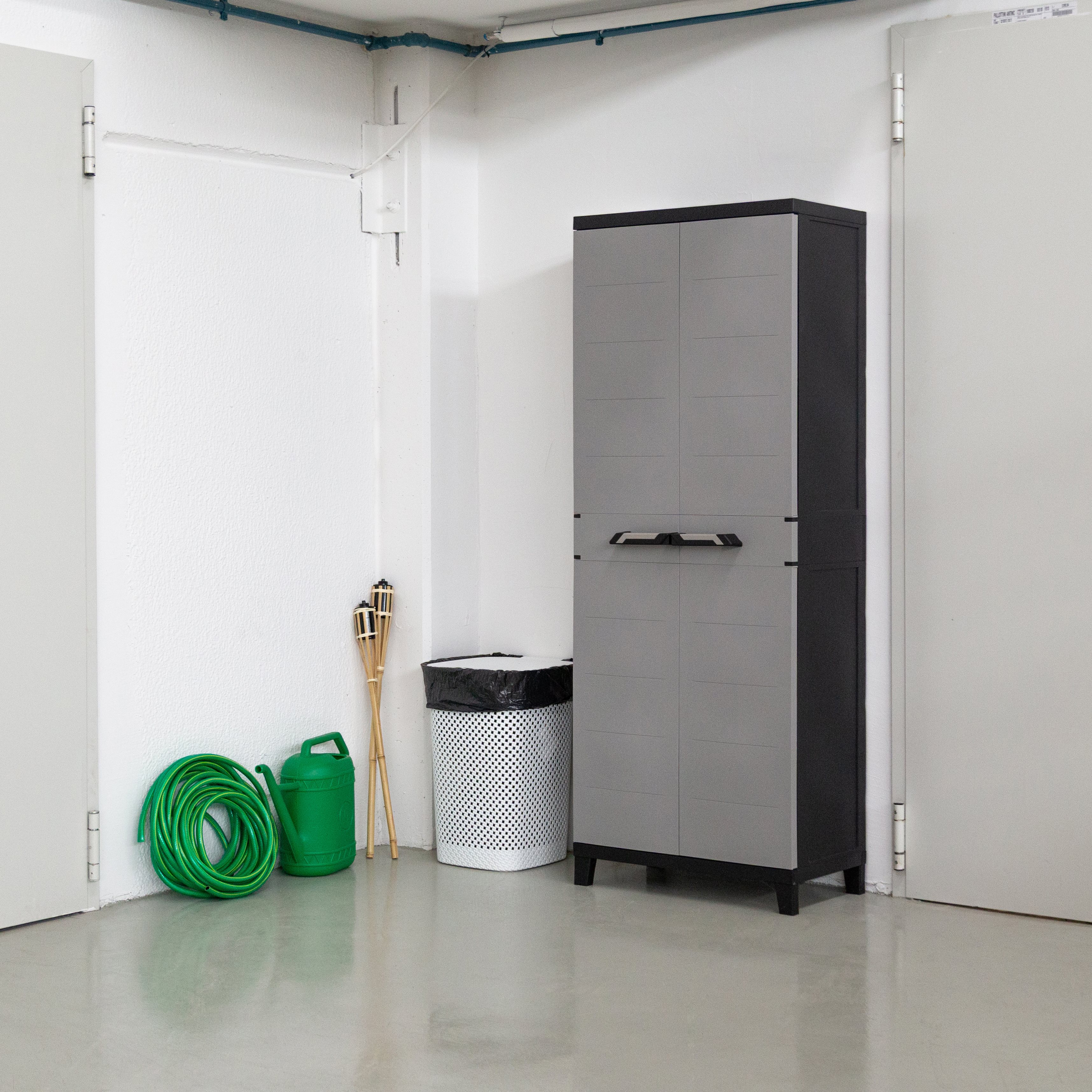 The PRIME utility cabinet offers a compact solution for home tool organization. Equipped with two doors, it provides easy access and protection for items inside. The internal shelves offer ample space to store brooms, mops, and other cleaning tools, keeping them organized and out of sight. The feet elevate the closet from the ground, protecting contents from moisture and facilitating cleaning underneath. Lightweight and durable, it's ideal for garages, basements, or storage rooms. Plastic ensures durability and ease of cleaning, making it a practical choice for the home.
