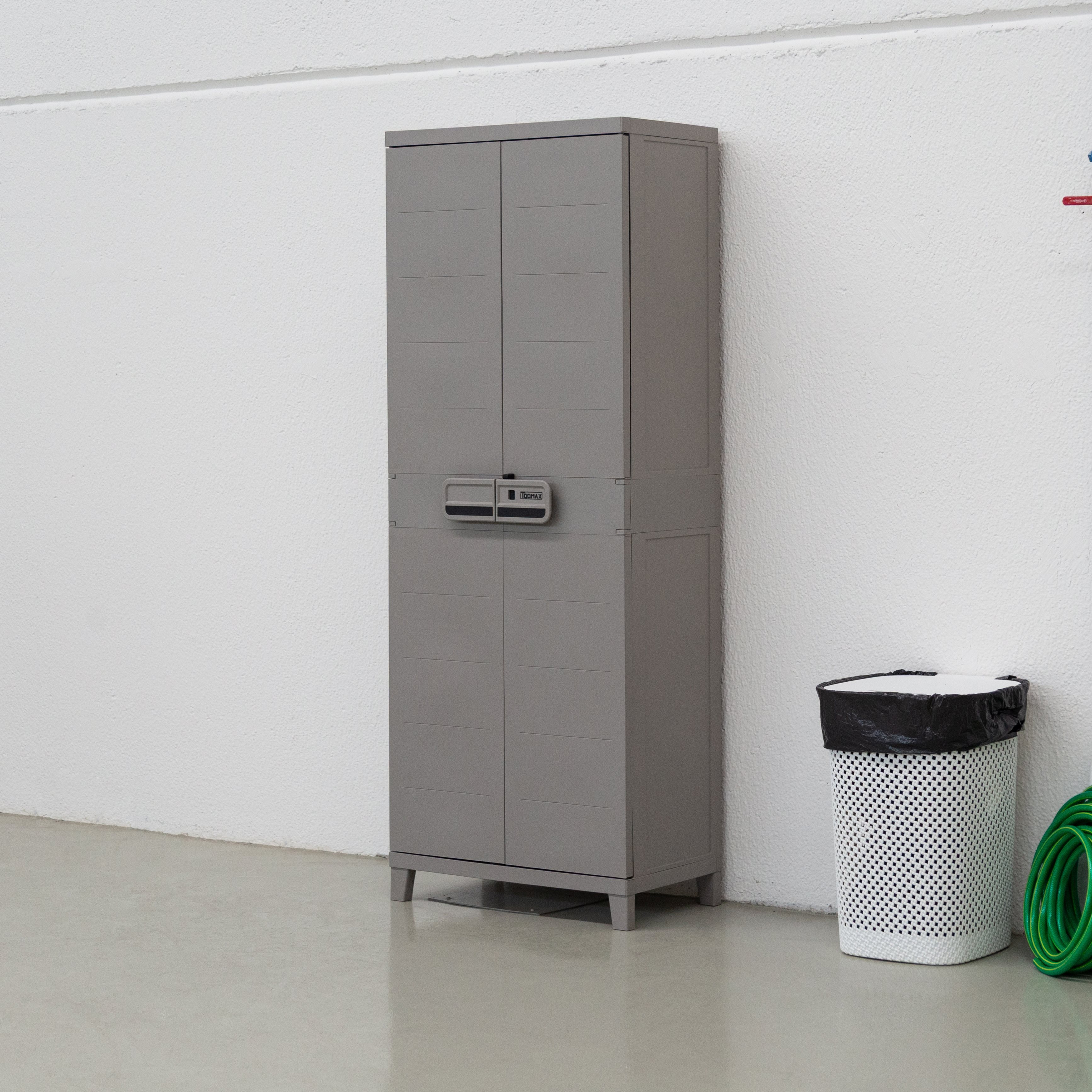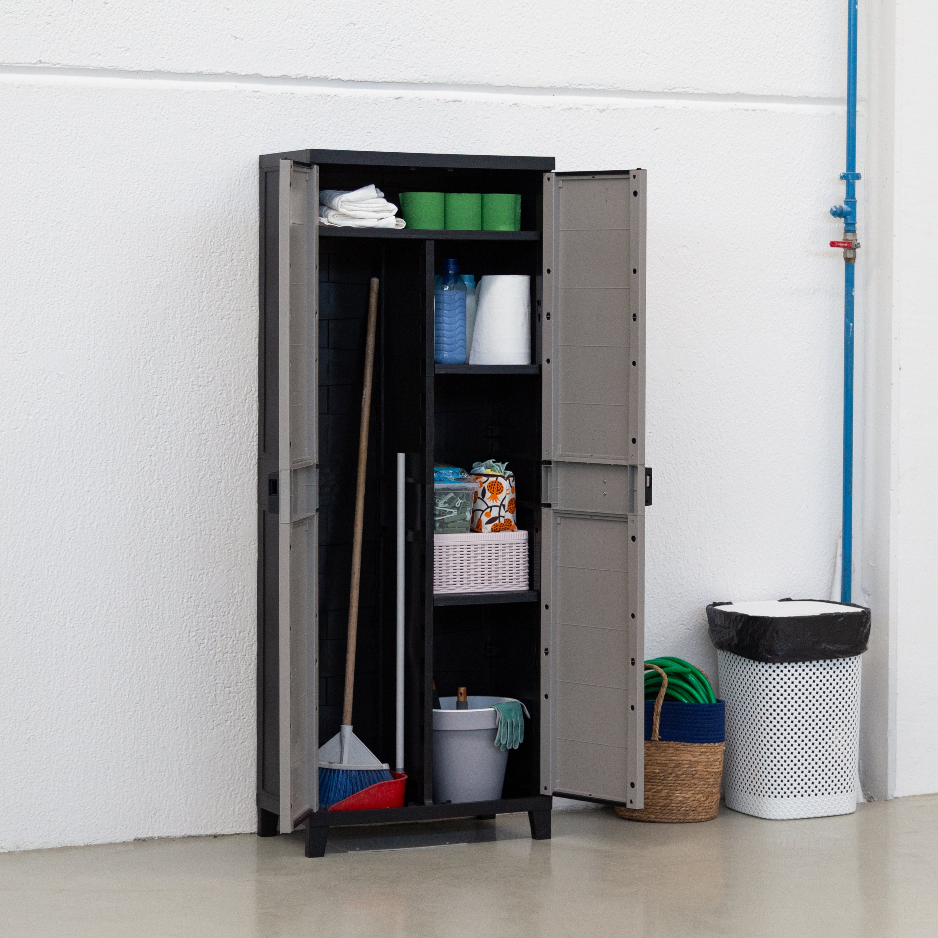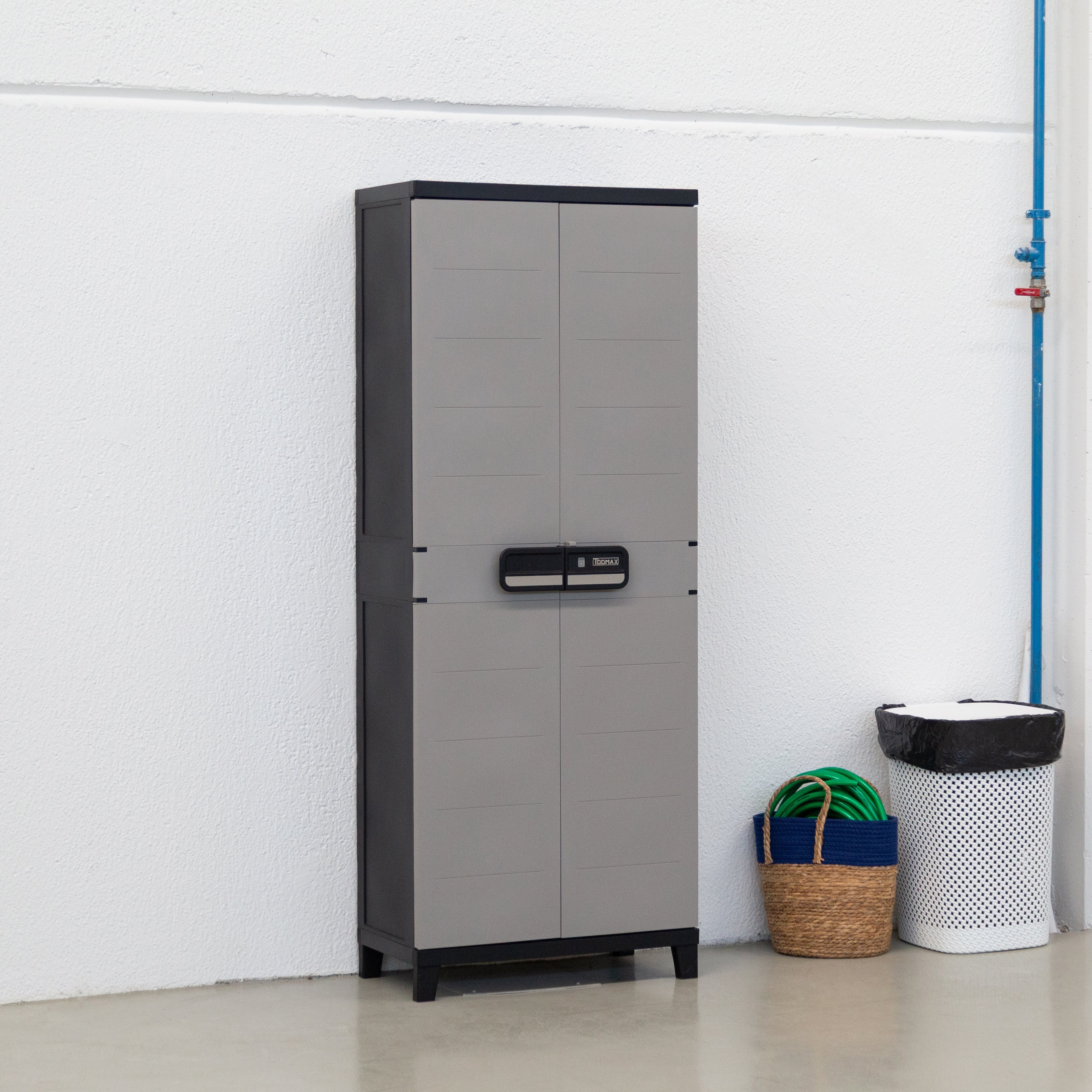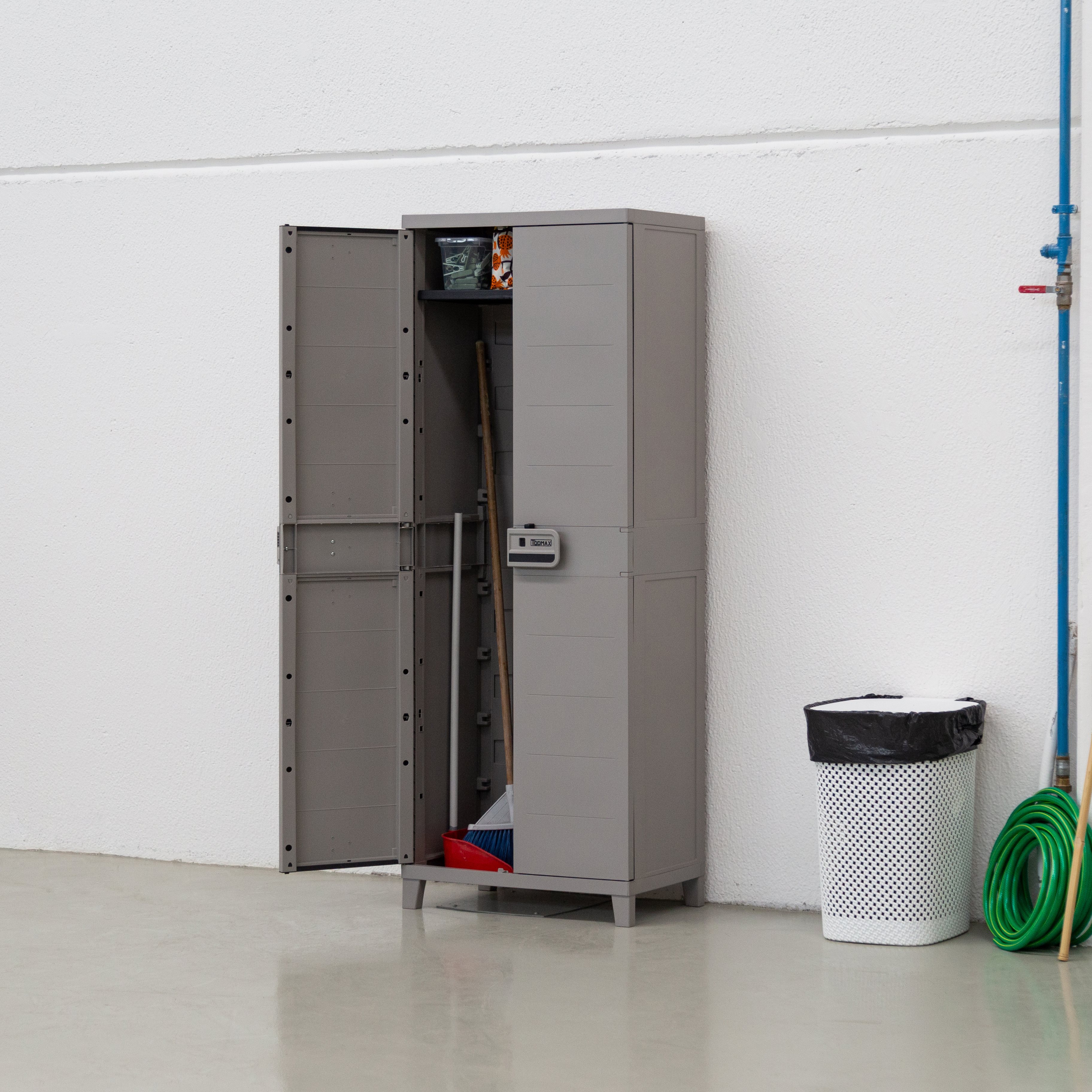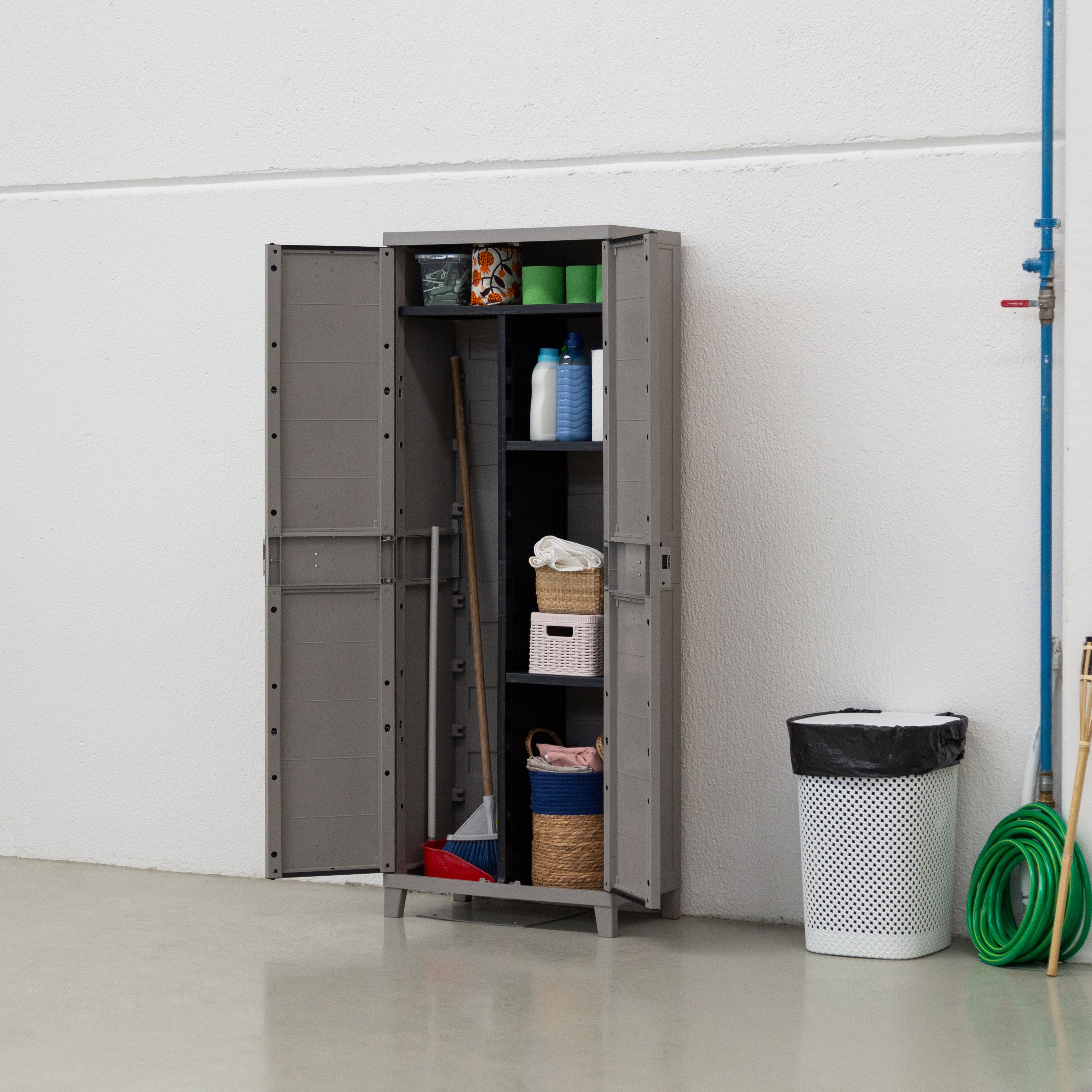 The SMART utility cabinet offers multiple shelves for better organization. Each shelf allows you to store items in an orderly and accessible way. Made of durable plastic, it is lightweight and easy to move. Ideal for garages, basements or outdoor spaces, it combines practicality and versatility in a simple design. The 2 doors protect the contents, ensuring safe storage. This cabinet is an effective solution for keeping cleaning tools in order, offering convenience and functionality for a well-organized home environment.