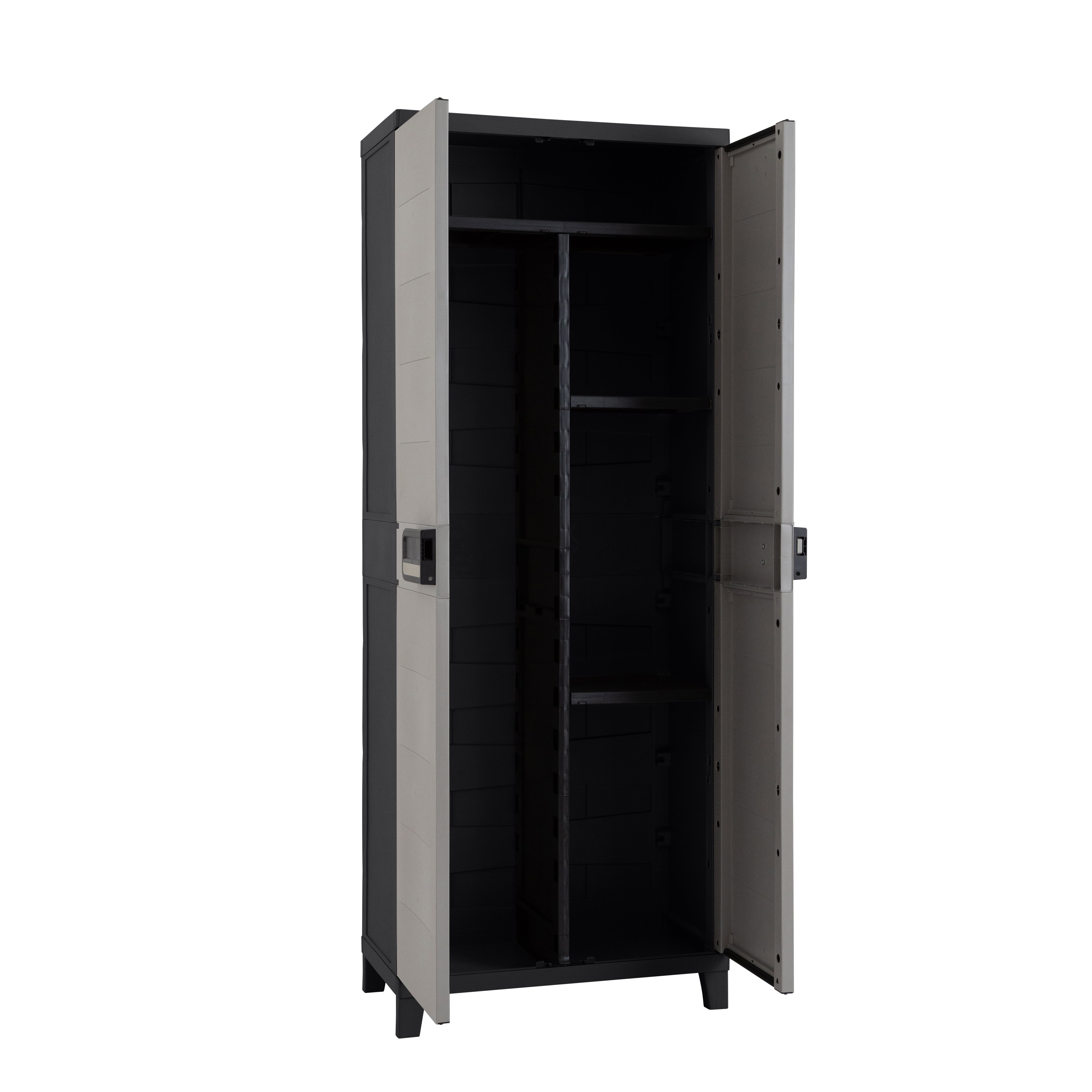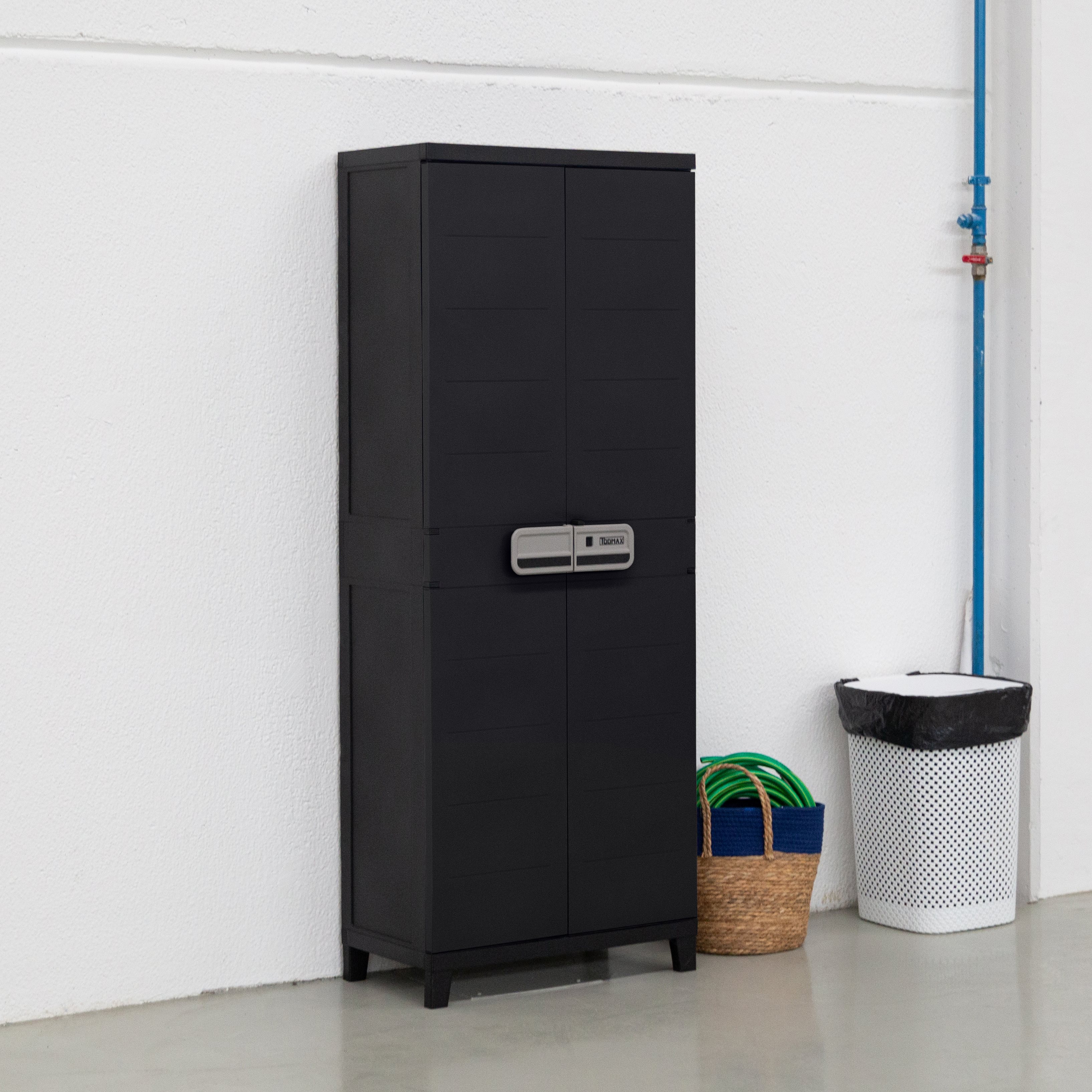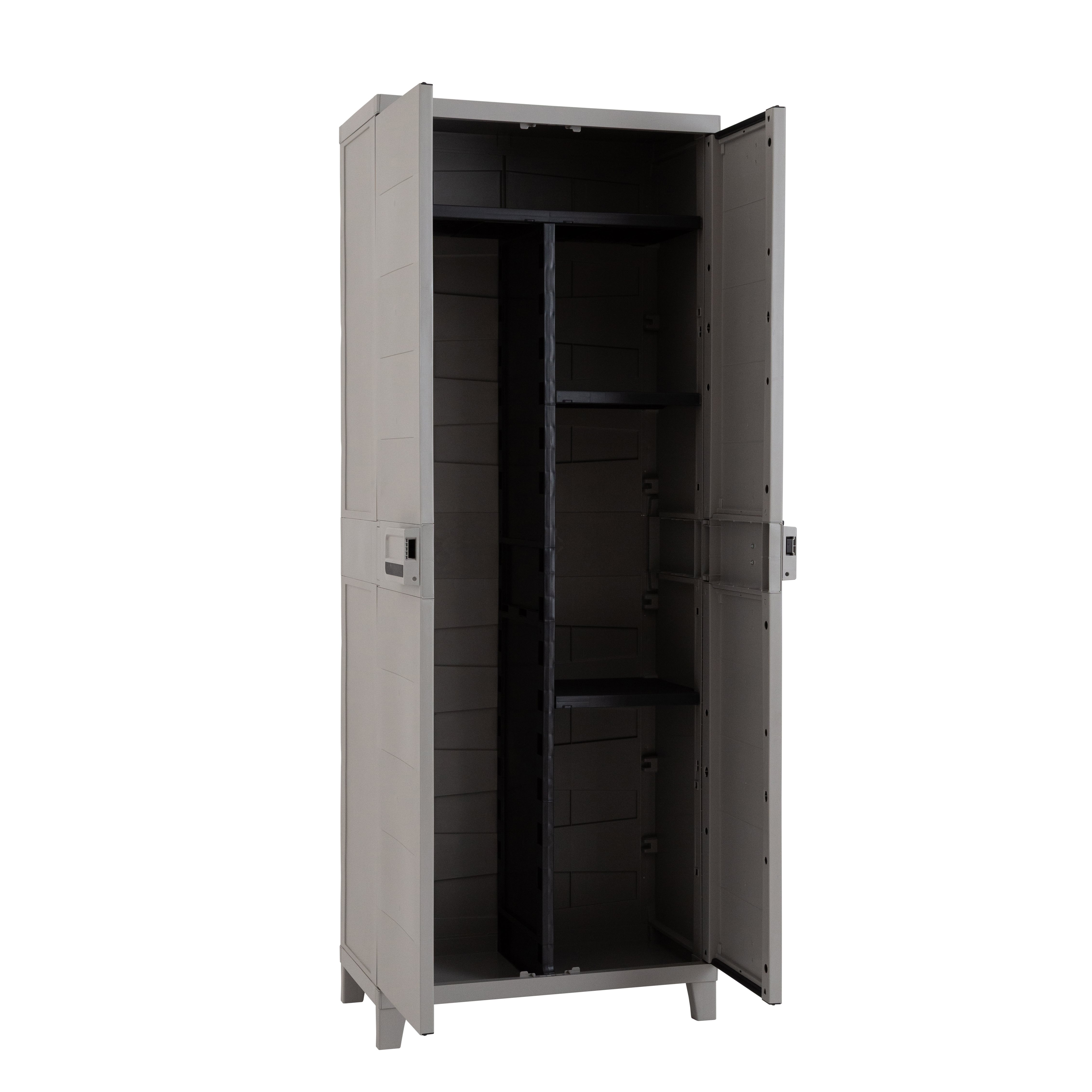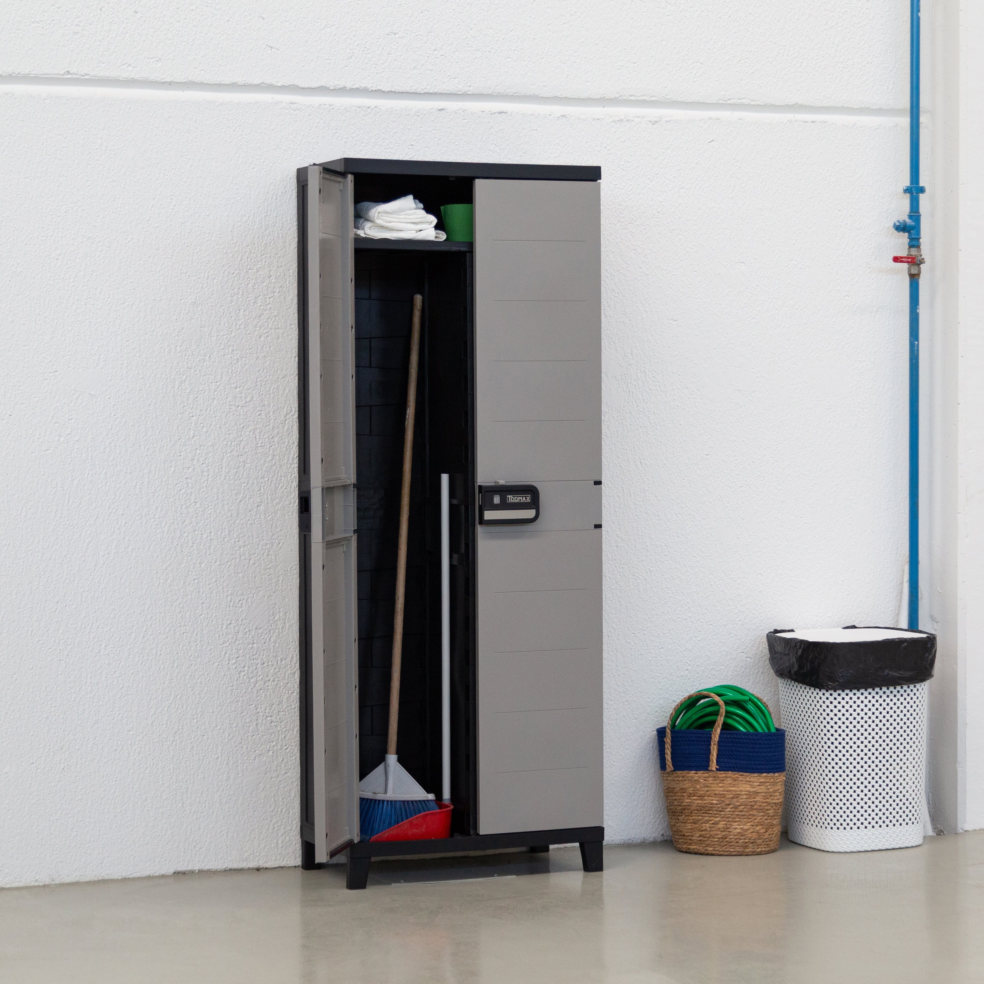 The SMART utility cabinet offers multiple shelves for better organization. Each shelf allows you to store items in an orderly and accessible way. Made of durable plastic, it is lightweight and easy to move. Ideal for garages, basements or outdoor spaces, it combines practicality and versatility in a simple design. The 2 doors protect the contents, ensuring safe storage. This cabinet is an effective solution for keeping cleaning tools in order, offering convenience and functionality for a well-organized home environment.