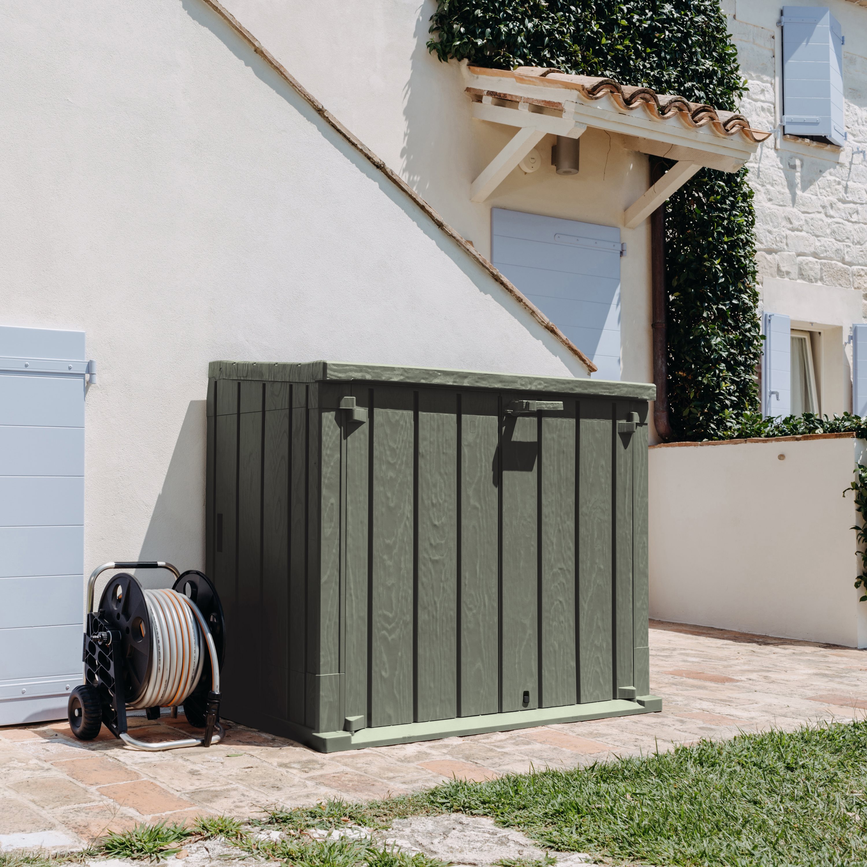 Il Baule Storer Plus è un portattrezzi da esterni con una capacità di 842 litri, ideale per riporre attrezzi da giardinaggio, cuscini e giochi. Realizzato in resina resistente ai raggi UV, combina funzionalità e stile con un elegante effetto legno in colore antracite/grigio tortora. Il baule è facile da montare con gli appositi attrezzi e dispone di prese d'aria per prevenire muffe e cattivi odori. È dotato di foro per il lucchetto (non incluso) per una maggiore sicurezza. Perfetto per mantenere il giardino ordinato e protetto.