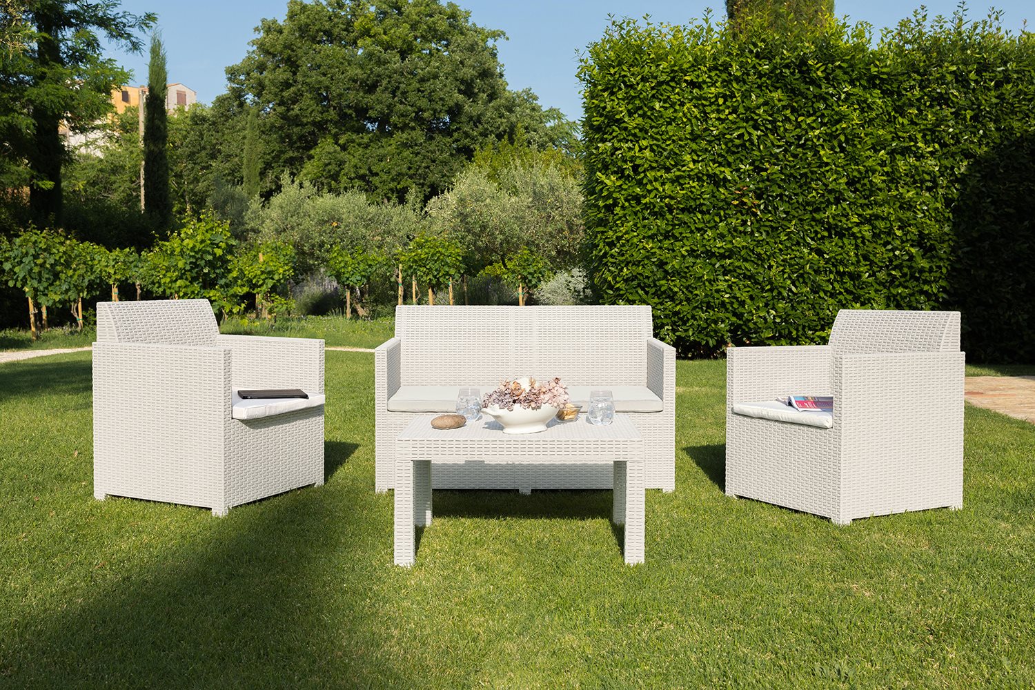 Il Toomax Set da giardino Leda è composto da un elegante tavolino, un divano a 2 posti e 2 poltrone, perfetto per creare un'area relax all'aperto. Realizzato in polipropilene resistente, questo set è progettato per durare nel tempo. Le poltrone e il divano sono dotati di cuscini imbottiti per garantire il massimo comfort. Facile da montare e mantenere, il set Leda è l'ideale per godersi momenti di relax all'aria aperta con stile.