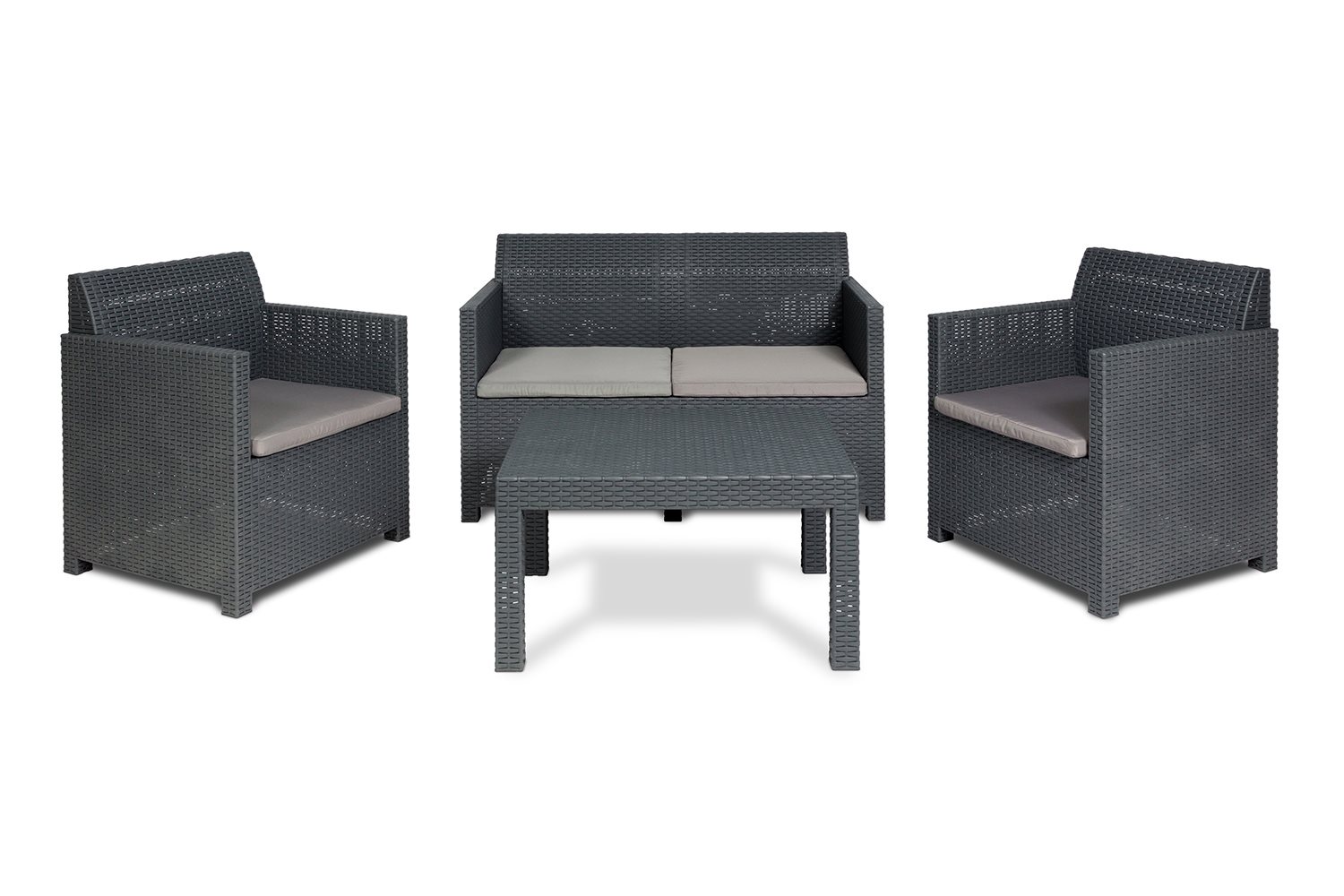 Set di 2 poltrone con cuscini, 1 divano con 2 sedute con cuscini e 1 tavolo da giardino largo