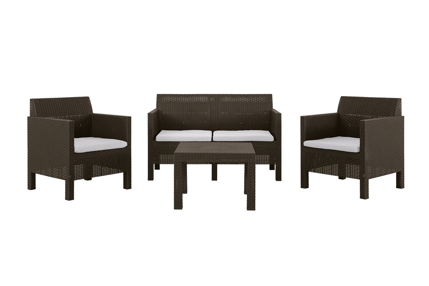 Il set da giardino Atena di 4 posti è la soluzione ideale per sfruttare il proprio spazio esterno e interno nel migliore dei modi. Le due poltrone con lo schienale ergonomico e il cuscino rappresentano anche una comoda seduta per gli ospiti e l'ampio tavolo da giardino ha un'ottima capienza e stabilità. Le dimensioni delle poltrone corrispondono a cm 63x65x76h, del divano di cm 122x65x76h e del tavolo a cm 58x58x41h. Il set Atena si sposa perfettamente con ogni tipo di arredamento e dona stile agli ambienti. È realizzato in plastica riciclata (polipropilene). Facile da montare, non necessita di manutenzione e può essere lavato con acqua e sapone neutro.